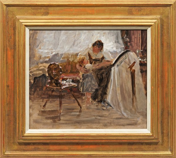 In lockerem, dynamischem Duktus und tonigem Kolorit gemalte, unmittelbar eingefangene Momentaufnahme: Im bäuerlichen Interieur unterbricht eine junge Frau ihre Arbeit am Stickrahmen und legt ihren Arm liebevoll um ein kleines Mädchen. Gekonnt flüchtiges, impressionistisches Werk aus dem frühen Oeuvre Koesters, in dem sich der überaus schaffensreiche Künstler unterschiedlichsten Motiven widmete, neben einer kleinen Werkreihe mit Akten und Allegorien schuf er eine Vielzahl von Porträts, Landschaften und Genreszenen. Nach dem Studium an der Karlsruher Akademie bei Carl Hoff, Claus Meyer und Ludwig von Kalckreuth, unternahm er zahlreiche Studienreisen u.a. nach Tirol, wo er sich 1896 in Klausen niederließ. Dort fand er zu unmittelbar in der Natur gemalten Landschaften und Tierbildern und schlussendlich auch zu seiner Vorliebe für Entenmotive, die ab ca. 1900 sein Schaffen fast ausschließlich bestimmten. Auf der Großen Berliner Kunstausstellung 1899 zeigte Koester erstmals Gemälde mit Entensujets, 1904 erhielt er auf der Weltausstellung in St. Louis eine Goldmedaille für ein Entengemälde. 1915 ließ sich der Künstler schließlich in Diessen am Ammersee nieder. Öl/Karton. Verso Nachlassstempel "Aus dem Nachlass des Kunstmalers A. Koester Diessen a./A." sowie Inventaretikett der Bayerischen Gemäldesammlung München. Wvz. Stein/Koester Nr. 29 (1988). 35,8 cm x 42,5 cm. Rahmen.