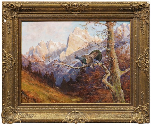 Vor dem mächtigen, effektvoll beleuchteten Bergmassiv des Wilden Kaisers ein Auerhahn auf seinem Balzbaum in der herbstlich gefärbten, bewaldeten Landschaft der Tiroler Alpen. Naturgetreu geschilderte Tier- und Landschaftsimpression des in München ausgebildeten Malers. Öl/Holzplatte. R. u. sign. mit Ortsangabe München. Verso bez. "Am Wilden Kaiser bei Kitzbühl". 54,4 cm x 72,4 cm. Rahmen.