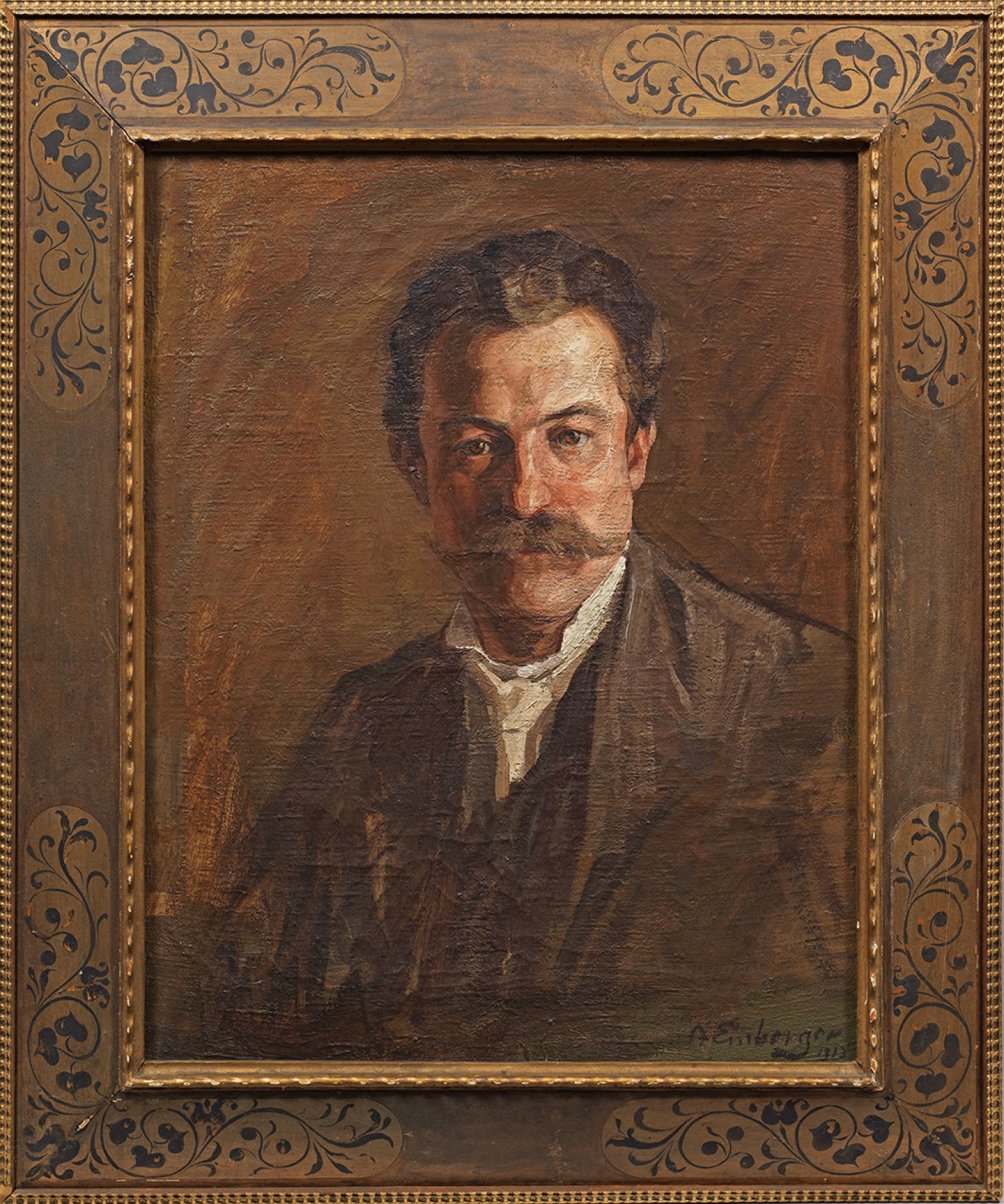 Mit breitem, weich-pastosem Duktus gemaltes Bildnis (oder Selbstporträt). Der aus Tirol stammende Maler, Grafiker und Bildhauer studierte 1900-1906 an den Akademien in München und Wien bei Gabriel von Hackl und Alois Delug. Danach lebte und arbeitete er im Heimatort Kramsach, seit 1920 in Telfs. 1921 hatte er seine erste Einzelausstellung in Innsbruck. Einbergers malerisches Oeuvre umfasst außer Porträts auch Landschaften, Genre- und Tierbilder in einem kraftvoll-realistischen und impressionistischen Stil. Öl/Lwd.; R. u. sign. u. dat. 1913. 73,5 cm x 58,5 cm. Wohl Original-Rahmen.