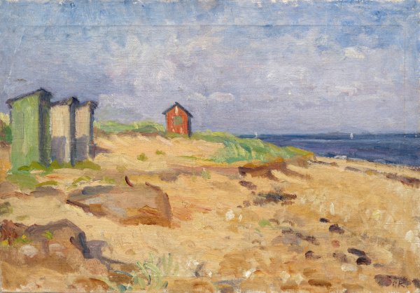 Spätimpressionistische, in gedämpfter Palette gemalte Küstenlandschaft mit Sandstrand und kleinen Umkleidehäuschen in den Dünen. Kothers Oeuvre wurde stark durch die "Brücke"-Maler Max Pechstein, Erich Heckel und Ernst Ludwig Kirchner sowie seinem Freund und Schwager Otto Mueller beeinflusst. 1912/13 hatte Kother erste erfolgreiche Einzel- und Gemeinschaftsausstellungen mit Pechstein und Beckmann. 1914 ging Kother von Dresden in die Kunstmetropole Berlin, wo ihn Herwarth Walden 1916 zusammen mit Pechstein und Lyonel Feininger in seiner "Sturm"-Galerie zeigte. 1921 widmete ihm die Galerie Moeller eine von Max Osborn gerühmte Einzelausstellung; 1922 erhielt Kother durch Max Liebermann den Ehrenpreis der Preußischen Akademie der Künste. In der Zeit des Nationalsozialismus gehörte auch Kother zu den verfemten modernen Künstlern. Öl/Lwd.; R. u. monogr.; 39 cm x 55,5 cm.