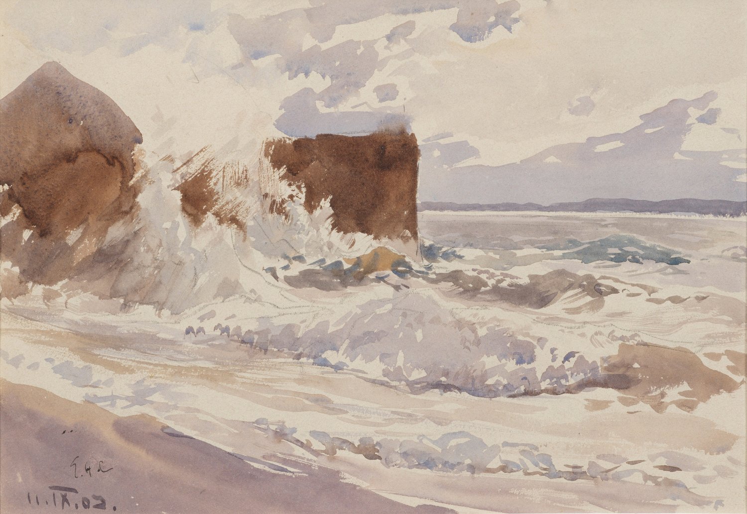 Atmosphärische, ausschnitthafte Impression einer felsigen Küste, umspült von kraftvollen, schäumenden Brandungswellen. Dynamische, locker skizzierte, sehr frühe Studie Comptons, der die Eindrücke seiner zahlreichen Reisen unmittelbar in Studien festhielt, um diese später in seinem Atelier in Gemälde umzusetzen. Ausgebildet bei seinem Vater Edward Theodore Compton, schuf er mit Vorliebe alpenländische Motive seiner oberbayerischen Wahlheimat. Aquarell/Papier. R. u. monogr. und dat. 11.IX.(19)02. Verso weitere Skizze, ebenfalls monogr. und dat. 9.VI.(19)03. 24,3 cm x 33,4 cm. Rahmen.