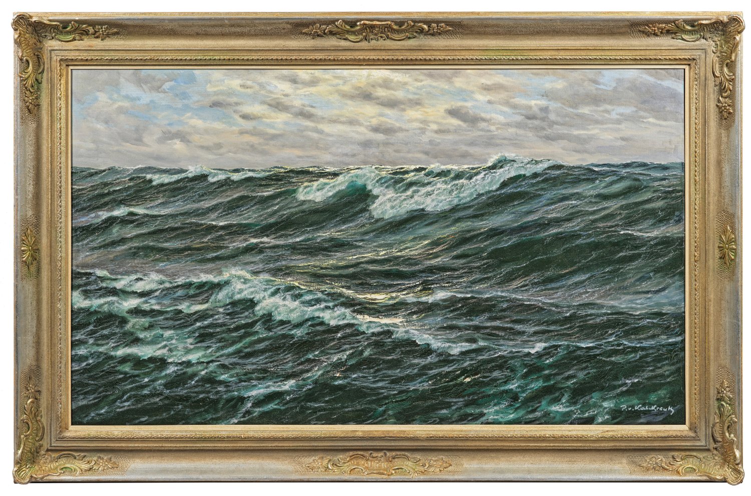 Kaum ein anderer Künstler hat Wellen, oft stürmisch bewegt, auf hoher See oder auch in den Uferzonen am Strand anbrandend, mit ihrer Gischt so eindringlich realistisch wiedergegeben und zugleich die atmosphärischen Stimmungen so virtuos geschildert wie Patrick von Kalckreuth. Hauptthema des Marine- und Landschaftsmalers war die Nordsee, die er teilweise mit Segelschiffen belebte. Öl/Lwd.; R. u. sign.; 70 cm x 120 cm. Rahmen.