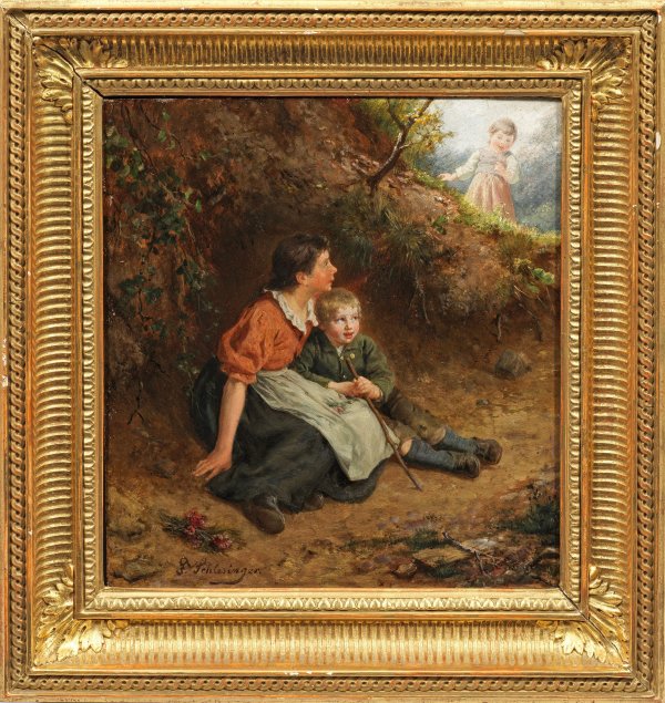 Unter einem verwurzelten Hang ducken sich eine junge Frau und ihr Sohn verschwörerisch in den Schatten, während die kleine Schwester oberhalb um die Ecke lugt und nach ihnen sucht. Feinfühlig inszenierte, charakteristische Genreszene Schlesingers, die ihren besonderen Reiz durch die fein nuancierte Farbgebung und Licht- und Schattenführung sowie die subtile Stofflichkeit erhält. Der bedeutende Maler des 19. Jhs. studierte an der Düsseldorfer Akademie bei Rudolf Jordan und bildete sich auf Studienreisen nach Antwerpen und Paris weiter. 1862/63 ließ er sich in München nieder und beschickte bis 1908 mit Darstellungen des ländlichen Lebens die nationalen und internationalen Ausstellungen. Als Maler reizvoller und einfühlsam geschilderter Kindermotive wurde er schon im 19. Jh. zu einem international gesuchten Künstler. Öl/Karton. L. u. sign.; 31 cm x 29 cm. Rahmen.