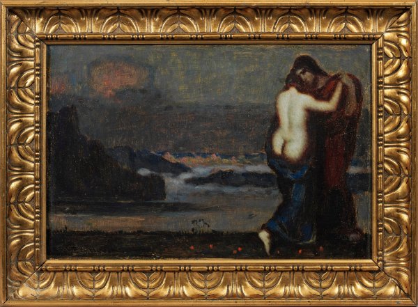 Vor einer angedeuteten, im mystischen Morgennebel verschwimmenden Landschaft das stehende, sich umarmende Paar mit Kalypso als Rückenakt. Das in vorwiegend tonigem Kolorit gemalte, aber auch mit leuchtenden Farbakzenten angelegte, motiv- und stiltypische Gemälde gehört zu den symbolistischen Jugendstil-Gemälden des Schweizer Malers, durch die er bekannt wurde. Frey-Moock ging 1902 nach München, wo er seit 1904 an der Akademie bei Karl Raupp und Wilhelm von Diez studierte und 1904 Assistent von Franz von Stuck wurde. In seinen Werken stellte er oft Liebespaare, mythologische und bacchantische Szenen dar, stark beeinflusst sowohl durch Stuck als auch Arnold Böcklin. 1908 stellte er erstmals im Künstlerhaus in Zürich aus, seit 1909 in den Ausstellungen des neugegründeten "Deutschen Künstlerverbandes" in München, später des Münchener Künstlerbundes "Die Unabhängigen". Öl/Malkarton. L. u. sign.; 29 cm x 44 cm. Rahmen.