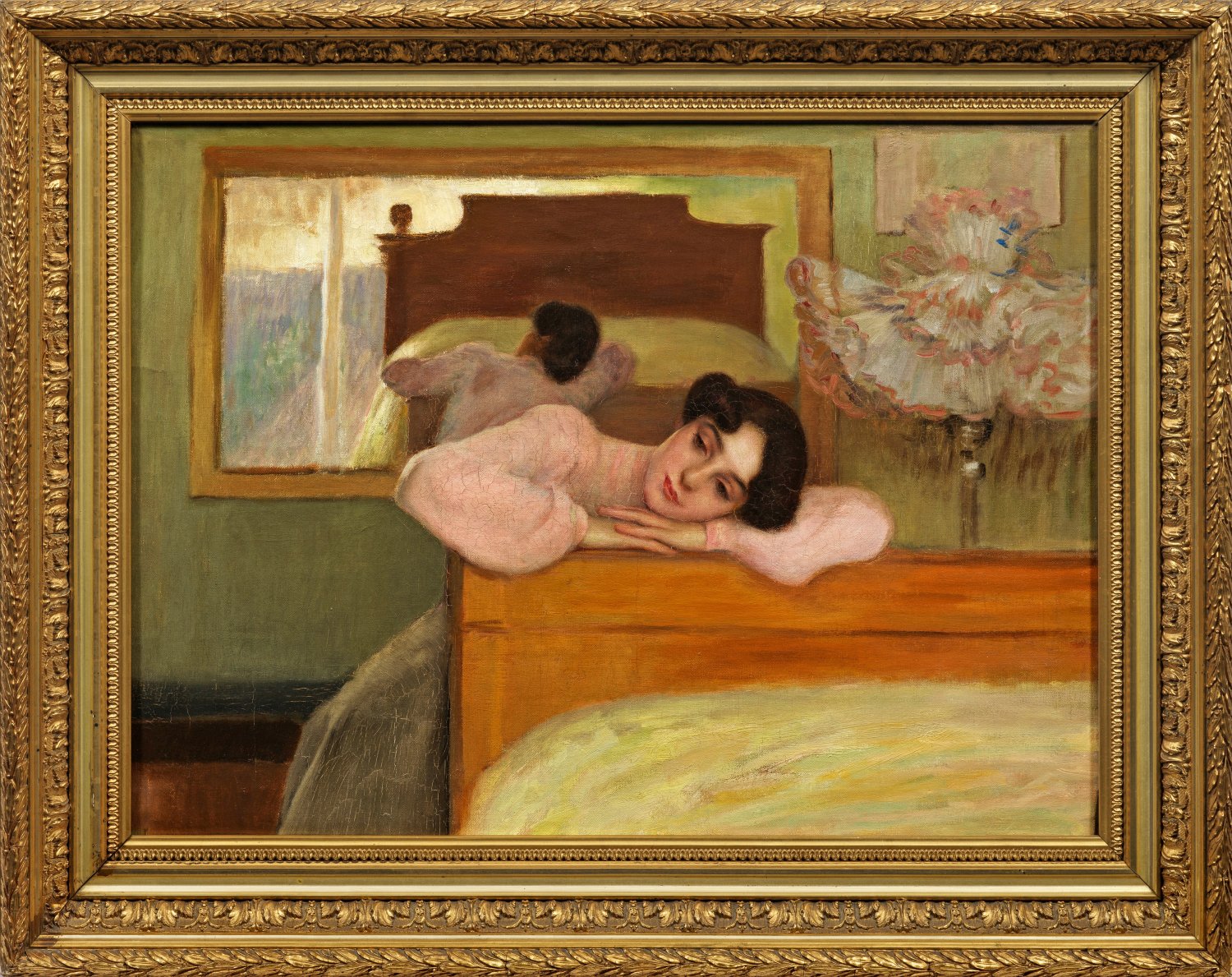 Wohl um 1900 oder kurz danach entstandenes Gemälde, das die Dame durch einen raffinierten Kunstgriff auch durch einen Spiegel an der Rückwand des Raumes zeigt. Der französische Maler beteiligte sich 1928 und 1929 am Salon des Indépendants. Außer Landschaften und Stillleben umfasst sein Oeuvre u. a. weibliche Akte. Öl/Lwd.; R. u. sign. (in die frische Farbe geritzt). 55 cm x 73 cm. Rahmen.