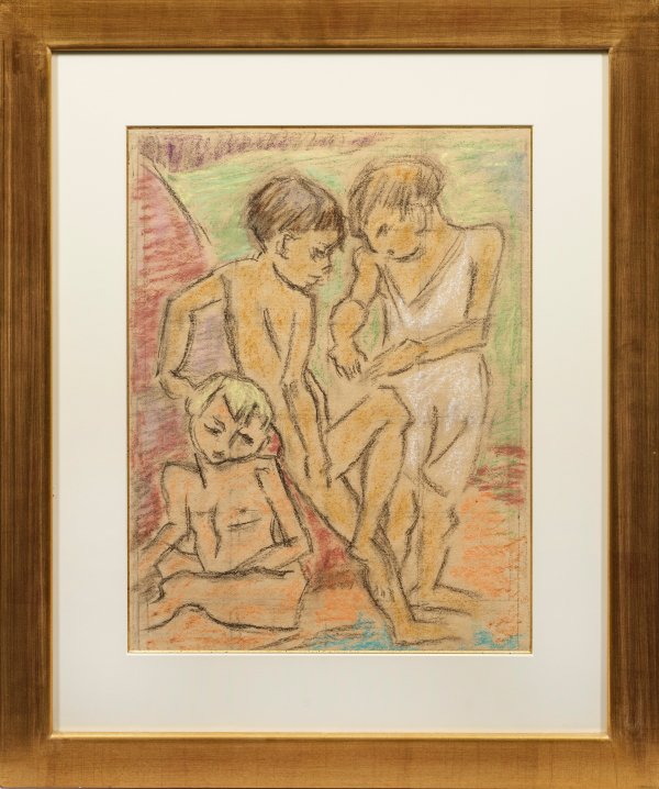 Expressionistisches, kräftig konturiertes Werk Kothers, das in Motiv und Stil durch den befreundeten Otto Mueller beeinflusst ist, dessen Schwager er 1909 wurde. Kother gehört zu den bedeutenden wiederentdeckten Künstlern der sog. "verschollenen Generation". Prägend wirkten auf ihn außer Mueller, die ebenfalls zur Künstlergruppe "Brücke" gehörenden Maler Max Pechstein und Erich Heckel. 1914 ging Kother nach Berlin, wo ihn Herwarth Walden 1916 zusammen mit Max Pechstein und Lyonel Feininger in seiner "Sturm"-Galerie zeigte. Ab 1918 reihten sich die Erfolge: 1919 beteiligte er sich mit der "Novembergruppe" an der Großen Berliner Kunstausstellung, 1921 widmete ihm die Galerie Moeller eine Einzelausstellung, 1922 erhielt Kother den Ehrenpreis der Preußischen Akademie der Künste. Im "Dritten Reich" gehörte auch Kother als Expressionist zu den verfemten "entarteten" Künstlern. Pastellkreiden/Papier. 59,5 cm x 46 cm (Passepartoutausschnitt). Rahmen.