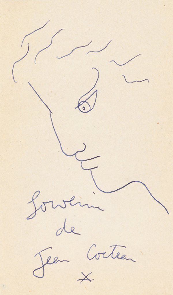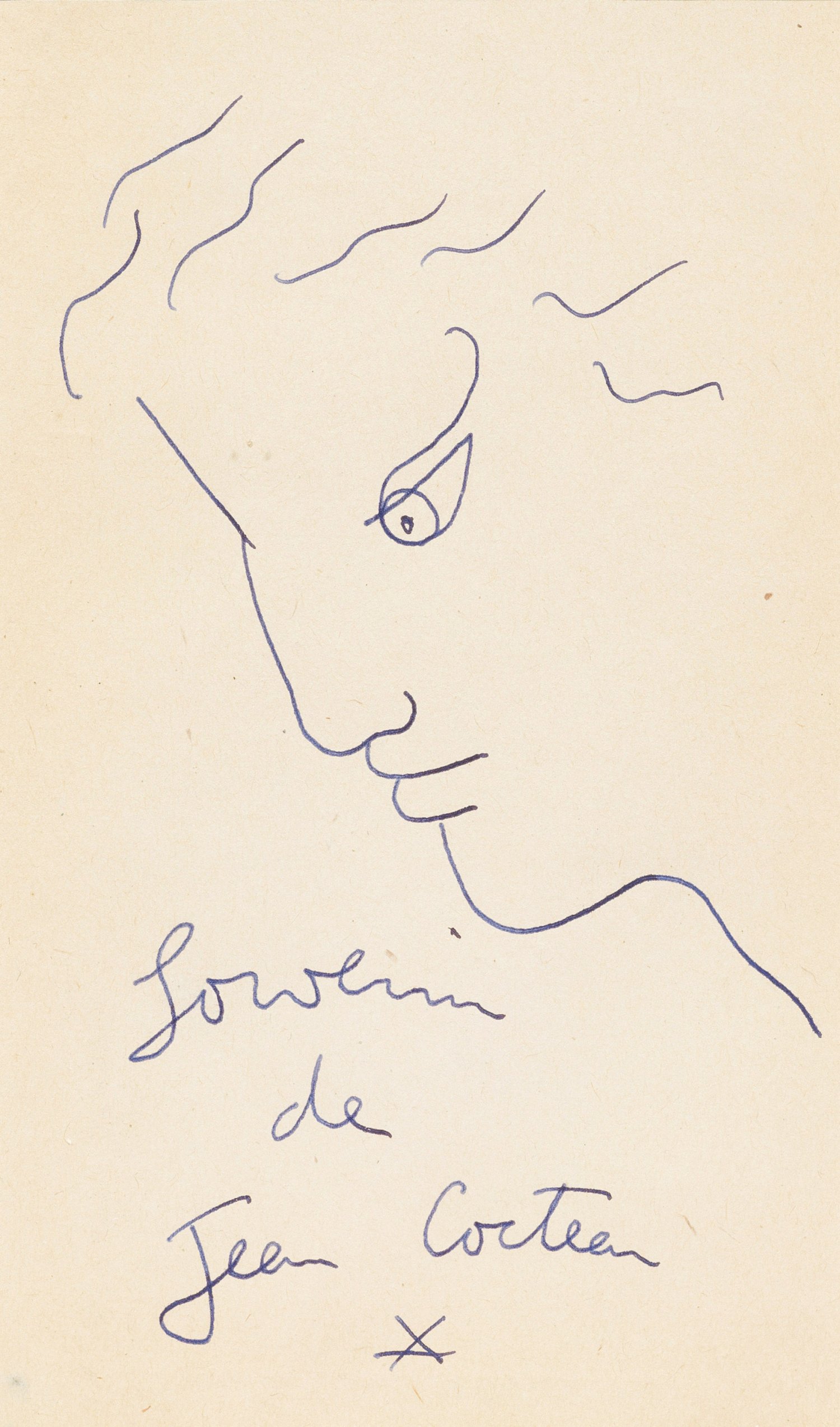 Mit wenigen, sicher gesetzten Strichen umrisshaft angelegte, motiv- und stiltypische Zeichnung des multitalentierten Universalkünstlers, Malers, Dichters, Filmregisseurs und Schauspielers, der das avantgardistische Kunst- und Geistesleben seiner Zeit prägte. Befreundet u. a. mit Picasso, Marcel Proust, Charlie Chaplin und liiert mit Jean Marais war Cocteau zudem vielfältig vernetzt und stand künstlerisch stets am Puls der Zeit. Blaue Tinte/Papier. Sign. mit Stern und bez. "Souvenir de". 17 cm x 11,9 cm. Rahmen.