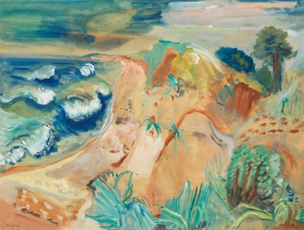 Furios und in tonigem Kolorit gemalte Landschaft des Expressionisten, der 1911 erstmals eine Studienreise an die Nord- und Ostsee unternahm. Kuhfuss, der von Philipp Franck und an der Hochschule für Bildende Künste in Berlin ausgebildet wurde, beteiligte sich ab 1912 an zahlreichen Ausstellungen, u. a. an den Großen Berliner Kunstausstellungen, der Freien und der Berliner Sezession, bevor er 1935-1945 als "Entarteter" Ausstellungsverbot erhielt. Aquarell/Papier. L. u. sign.; 36,5 cm x 48,3 cm (Passepartoutausschnitt). Rahmen.