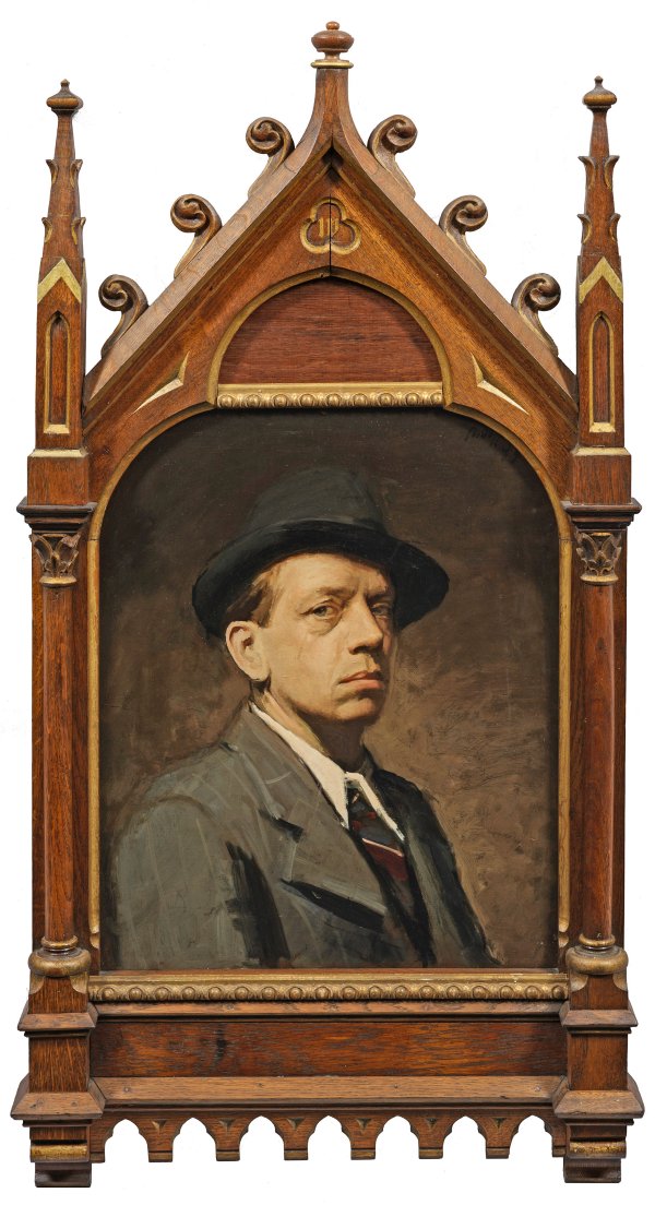 Privates, ausdrucksvoll charakterisierendes, realistisches Brustbildnis des Hochadeligen im Dreiviertelprofil nach links, in einem hellgrauen, großkarierten Anzug, auf dem Kopf einen dunkelgrauen Hut. Öl/Hartfaser. R. o. undeutl. sign. u. dat. (19)43. Verso Ligatur-Monogr.-Brandstempel u. zwei Wachssiegel mit Monogr. "W". 60 cm x 50 cm. Neogotischer Eichenrahmen mit gemaltem Monogr. "W" im Dreipass.