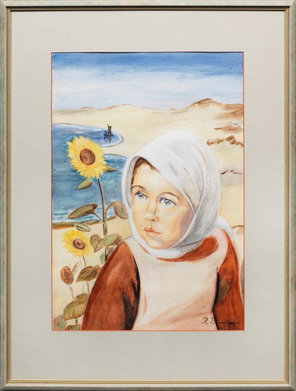 Bildnis eines Fischermädchens mit Sonnenblumen vor den Ostseedünen bei Nidden