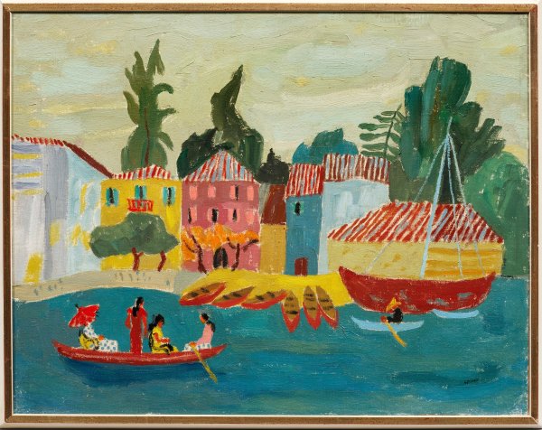 In expressiven, leuchtenden Farben gemalte, flächig konzipierte Küstenansicht, die die Auseinandersetzung Schöllkopfs mit den Arbeiten der Fauves und Henri Matisses verdeutlichen. Schöllkopf war Schüler der Kunstgewerbeschule in Stuttgart und studierte anschließend an der dortigen Akademie bei Poetzelberger, Haug und Landenberger. Nach impressionistischen Anfängen in toniger Palette, wie sie Landenberger anwandte, hegte er den Wunsch nach einer intensiveren Farbigkeit. Im Zuge dessen setzte er sich mit dem Schaffen Adolf Hölzels auseinander, unternahm zahlreiche Reisen und fand schließlich Inspiration in französischen Vorbildern. Öl/Lwd.; R. u. teilw. seitlich sign. und dat. 1948. Verso bez. mit Ortsangabe Stuttgart-Riedenberg, dat. 1948 und betitelt. Werk-Nr. 453 und 48/1. 40,3 cm x 51,3 cm. Rahmen.