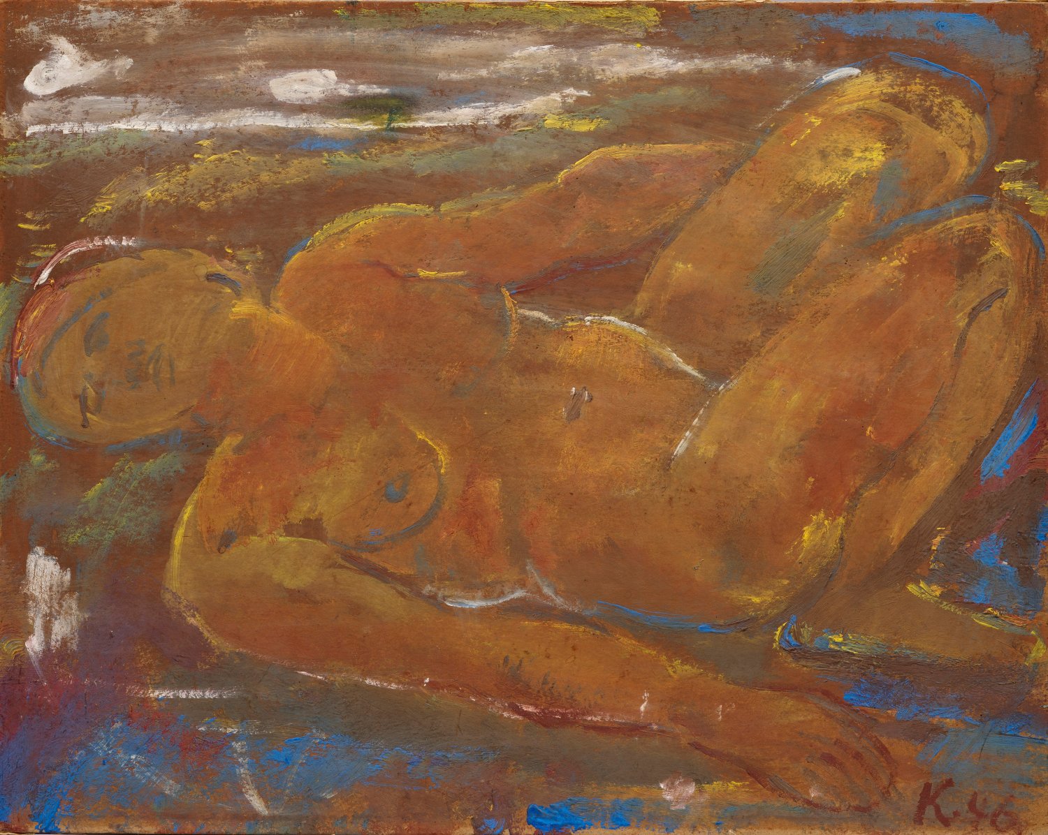 Expressives, dynamisches Werk Kluths, der an der Karlsruher Akademie bei Albert Haueisen studierte und Meisterschüler von August Babberger war. 1922 ging er nach Hamburg und wurde Mitglied der Hamburgischen Sezession. 1929 und 1934 reiste der Künstler für eine Zusammenarbeit zu Edvard Munch. Später fielen seine Werke im "Dritten Reich" unter das Vedikt "entartete Kunst". Mischtechnik/Karton. R. u. monogr. und dat. (19)46. 39,8 cm x 50,6 cm.