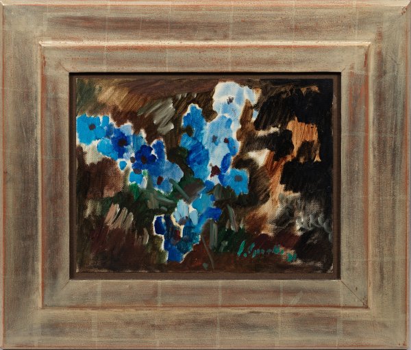 In Blau- und Brauntönen gemaltes, sich der Abstraktion näherndes Blumenstück aus dem reifen Oeuvre Sprottes, der u. a. bei Emil Orlik, Kurt Wehlte, Maximilian Klewer und Karl Hagemeister lernte. 1945 zog der Künstler nach Sylt und ließ sich von den dortigen Strand- und Landschaftsmotiven, aber auch der regionalen Flora inspirieren. Öl/Lwd., aufgelegt oder kaschiert auf Karton oder Platte. R. u. sign. und dat. (19)91. Verso nochmals sign. und dat. 1991 sowie mit Ortsangabe Kampen/Sylt und ausführlicher, persönlicher Widmung des Künstlers. 24 cm x 32 cm. Rahmen.