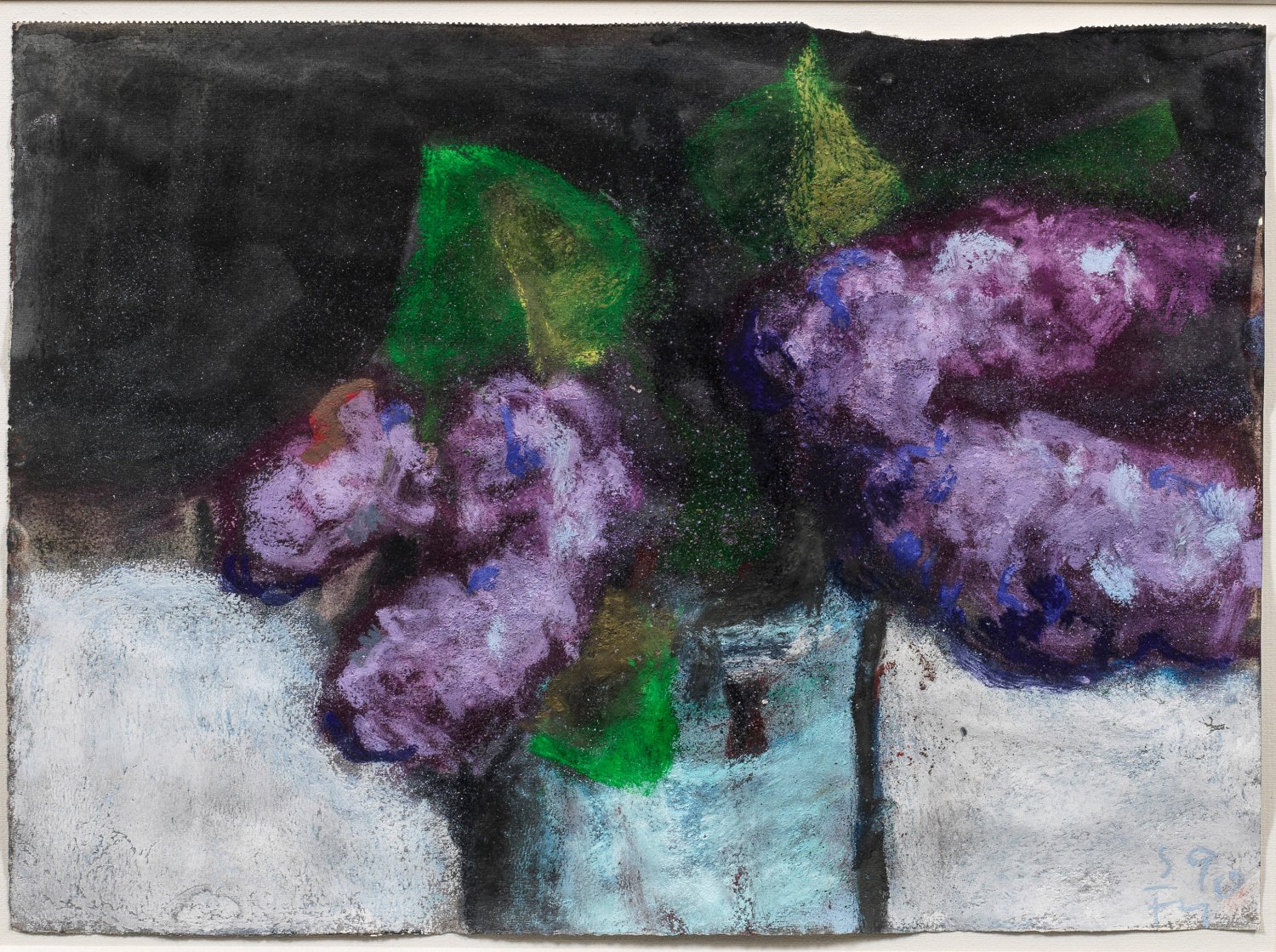 Eines der Hauptsujets Fußmanns sind Blumenstillleben, die er inspiriert durch die Expressionisten, mit besonderer Passion malt und hierzu selbst schreibt: "Blumen sind schnell verwelkt und ein kurzes Vergnügen. Aber sie werden dann noch blühen, wenn die Dialoge über die Kunst alle passé sind. Überhaupt sind die Farben der Blumen mit nichts zu vergleichen (...) übertreffen unsere Erwartungen bei weitem". Nach seinem Studium an der Folkwang-Schule in Essen und an der Hochschule für Bildende Künste in Berlin, erhielt Fußmann 1972 den Villa Romana-Preis und stellte in der Neuen Nationalgalerie in Berlin aus. 1974-2005 wirkte er als Professor in Berlin. Anlässlich des 70. und 80. Geburtstags wurde sein Oeuvre in umfassenden Werkschauen gezeigt, u. a. im Landesmuseum Schloss Gottorf und im Museum Barberini in Potsdam. Mischtechnik/Papier. R. u. monogr. bzw. sign. u. dat. (19)90. Blatt ca. 29,4 cm x 40,7 cm. Verso Etikett der Galerie Boisserée, Köln. Rahmen.
