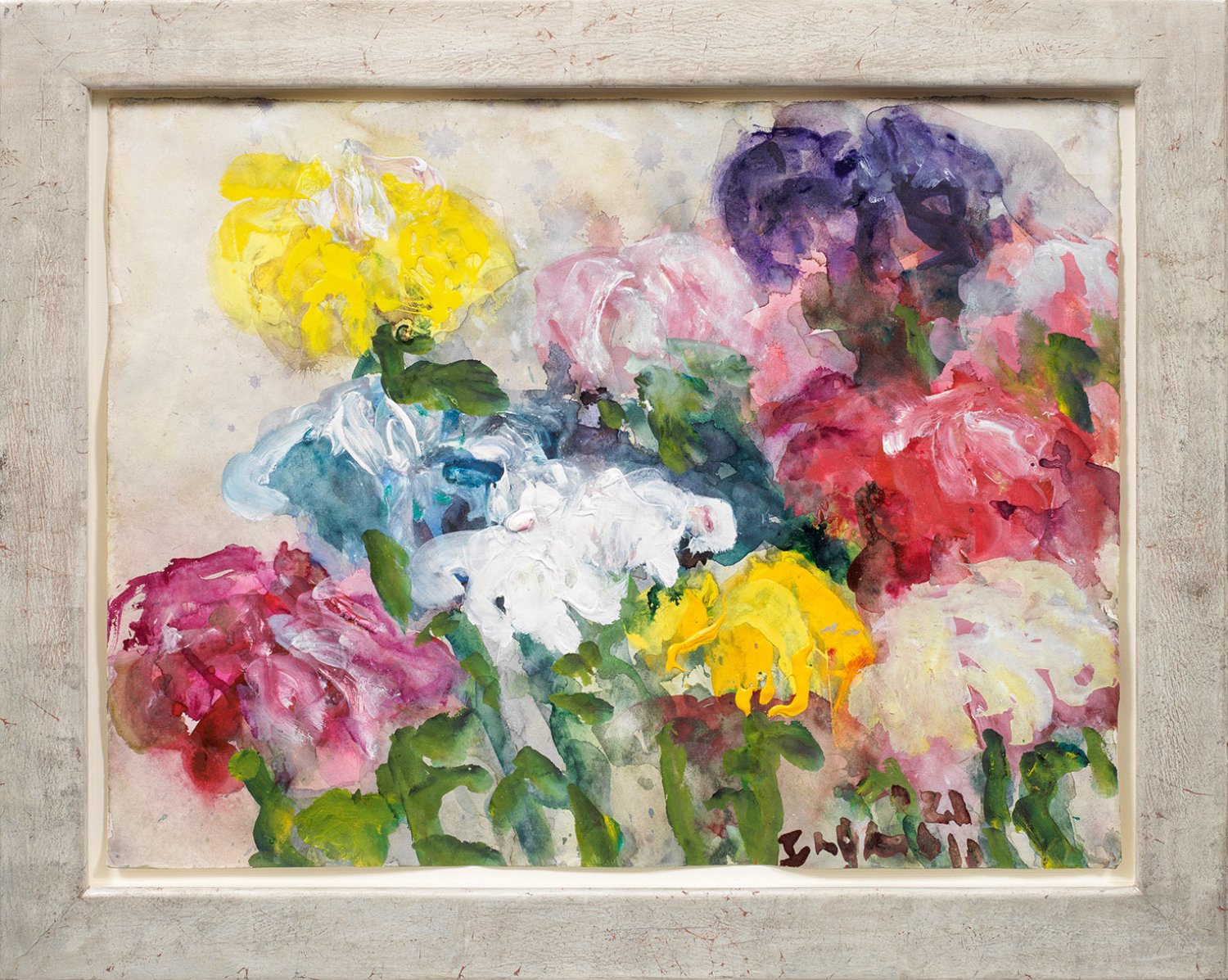 Mit expressiv leuchtender Palette und wuchtvollem, breitem Duktus gemaltes Gartenstillleben Fußmanns, der sich seit 1977 intensiv mit dem Bildthema des Blumenstilllebens auseinandersetzt, bevorzugt mit Gartenblumen, womit er der Tradition Emil Noldes folgt. Fußmann studierte 1957-1961 an der Essener Folkwang Schule und 1962-1966 an der Berliner Hochschule für Bildende Künste. 1972 fand er sein Malerparadies im schleswig-holsteinischen Gelting, pendelt seitdem zwischen der Ostsee und Berlin. Im selben Jahr erhielt Fußmann den Villa Romana-Preis und stellte in der Neuen Nationalgalerie in Berlin aus, womit ihm der Durchbruch gelang. 1974-2005 lehrte er als Professor an der Berliner Kunsthochschule. Nach zahlreichen Einzelausstellungen wurde sein Oeuvre anlässlich des 70. und 80. Geburtstags in umfassenden Werkschauen gezeigt, u. a. im Schleswig-Holsteinischen Landesmuseum für Kunst und Kulturgeschichte im Schloss Gottorf und im Museum Barberini in Potsdam. Zentrale Motive seiner Gemälde, Aquarelle und Grafiken sind außer der schleswig-holsteinischen Landschaft insbesondere Frühlings- und Sommerblumen sowie Ausschnitte aus seinem Garten in Gelting von oft intensiver Farbigkeit. Aquarell und Öl/Papier, R. u. sign. und dat. (20)21. Ca. 41,5 cm x 55 cm. Rahmen.