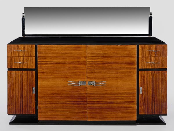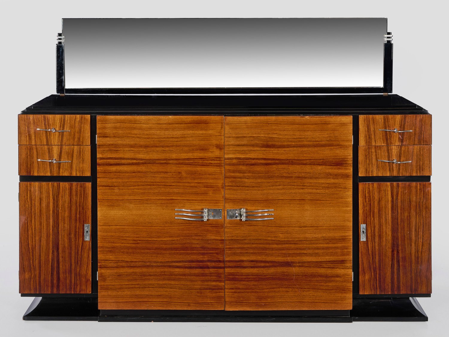 Palisander, furniert sowie Holz, flächendeckend schwarz lackiert. Über zurückgesetztem, konkav eingezogenem Sockel querrechteckig angelegter Korpus. In der gegliederten Front vier Türen unterschiedlicher Größe sowie vier Schubfächer. Gestuft ansteigende Deckplatte sowie rücks. flacher Spiegelaufsatz. Verchromte Applikationen. Rest.; H. 148 cm. 201 cm x 50 cm.
