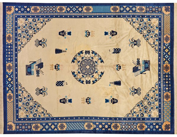 China. Wolle auf Baumwolle. Im vanillefarbenen Innenfeld zentrales Rundmedaillon sowie Musterung aus gestreuten taoistischen Symbolen. Umlaufend breite Bordüre aus unterschiedlichen Mosaikmustern, begrenzt von Reserven. 284 cm x 366 cm.