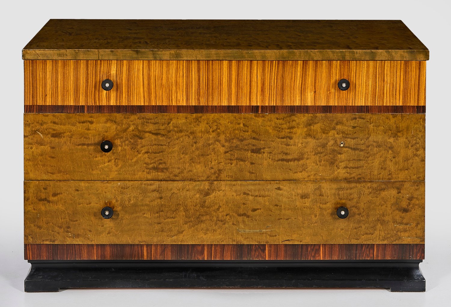 Ahorn, dunkel gebeizt, Nussbaum und Palisander, furniert und teilw. ebonisiert. Gerader, querrechteckig angelegter Korpus auf gekehltem Zargensockel. In der optisch gegliederten Front drei breite Schubladen. Dem Korpus entsprechende Deckplatte. H. 60 cm. 97 cm x 45,5 cm.