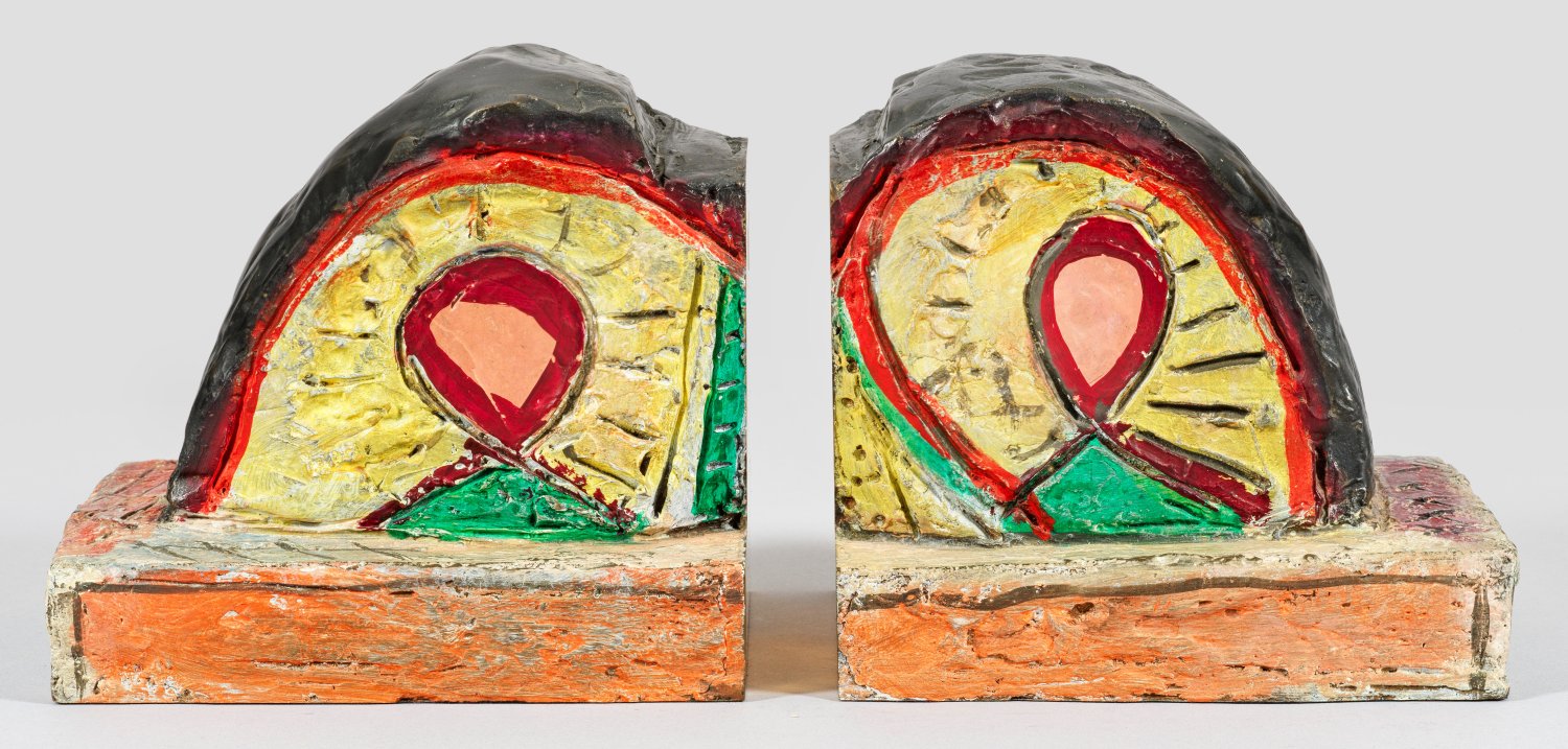 A pair of hand-painted, dark patinated and polished bronze bookends, 1993. No. 90 from an edition of 998. One of the bookends with artist's monogram, foundry stamp and edition no.