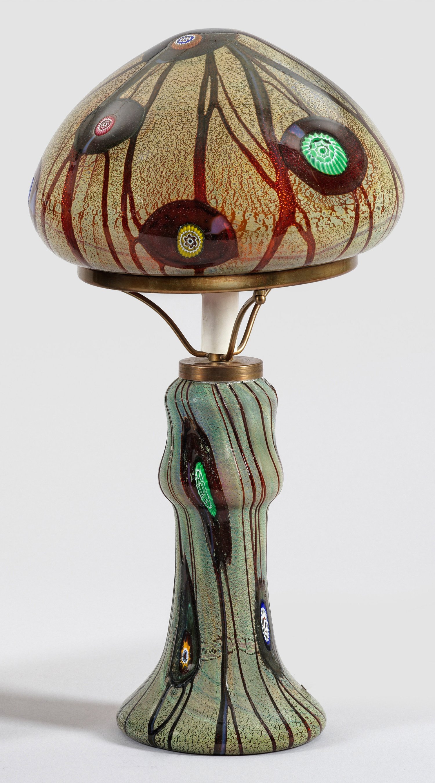 1-flg.; hellgrün lüstrierend überfangenes, rotbraunes Glas mit polychromen Einschmelzungen. Balusterförmiger, sich konisch verjüngender Korpus als Träger für Leuchtmittel sowie kuppelförmigen Lampenschirm. Elektrifiziert. H. 51 cm.