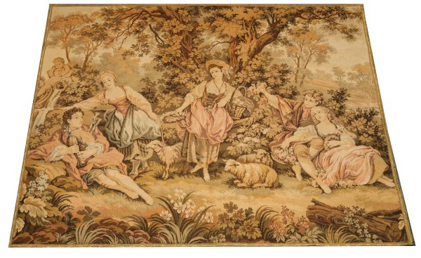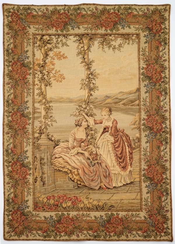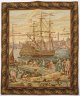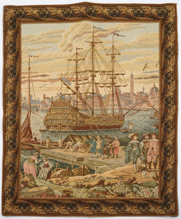 Baumwolle, in unterschiedlichen Braun- und Pastelltönen gewebt. Flächendeckende Galanterieszenen bzw. Hafenansicht mit großem Segelschiff. Umlaufend teilw. breite Bordüre aus Blüten- und Blattranken. 76 cm x 65 cm - 134 cm x 158 cm.