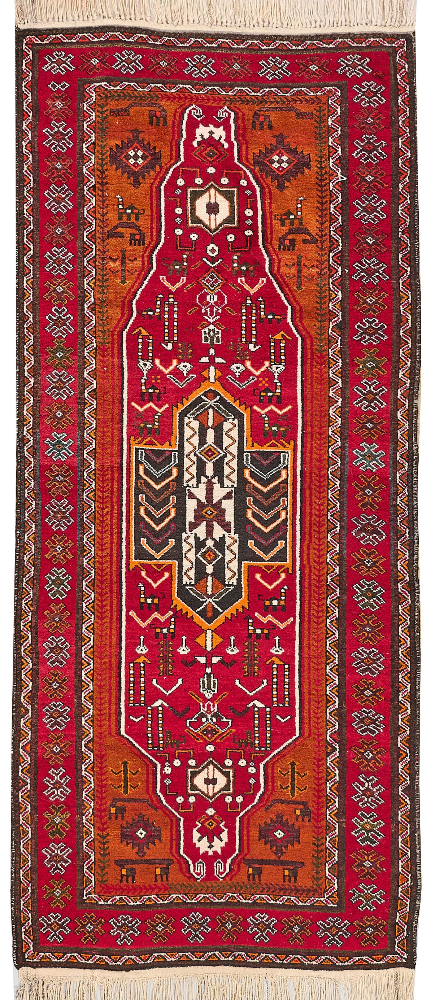 Afghanistan. Wolle auf Wolle. Auf orangefarbenem Fond große, gestreckte rote Reserve mit stilisierten Tierdarstellungen. Umlaufend rote Bordüre aus Rauten. 215 cm x 94 cm.