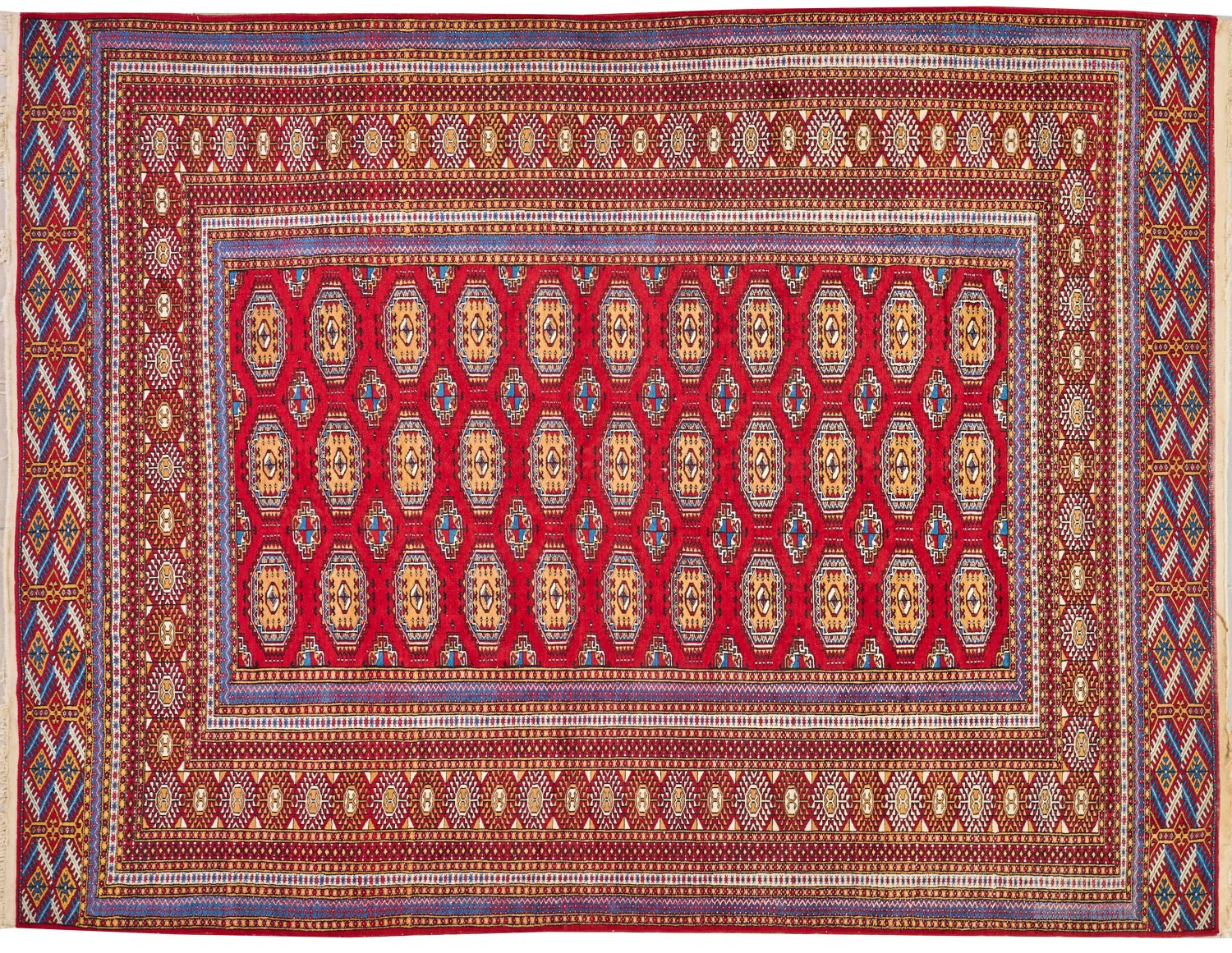 Pakistan. Wolle auf Baumwolle. Im hellroten Innenfeld drei Reihen aus rautenförmigen Göls im Rapport. Umlaufend breite, vielteilige Bordüre. 245 cm x 187 cm.