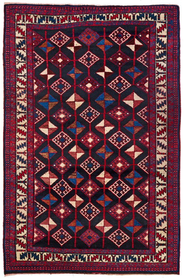 Persien. Wolle auf Baumwolle. Auf dunklem Fond flächendeckend durchlaufendes Mosaikmuster aus unterschiedlichen, durch schmale Bänder verbundene Rauten im Rapport. Umlaufend schmale Blätterbordüre, begrenzt von roten Bändern. 163 cm x 249 cm.