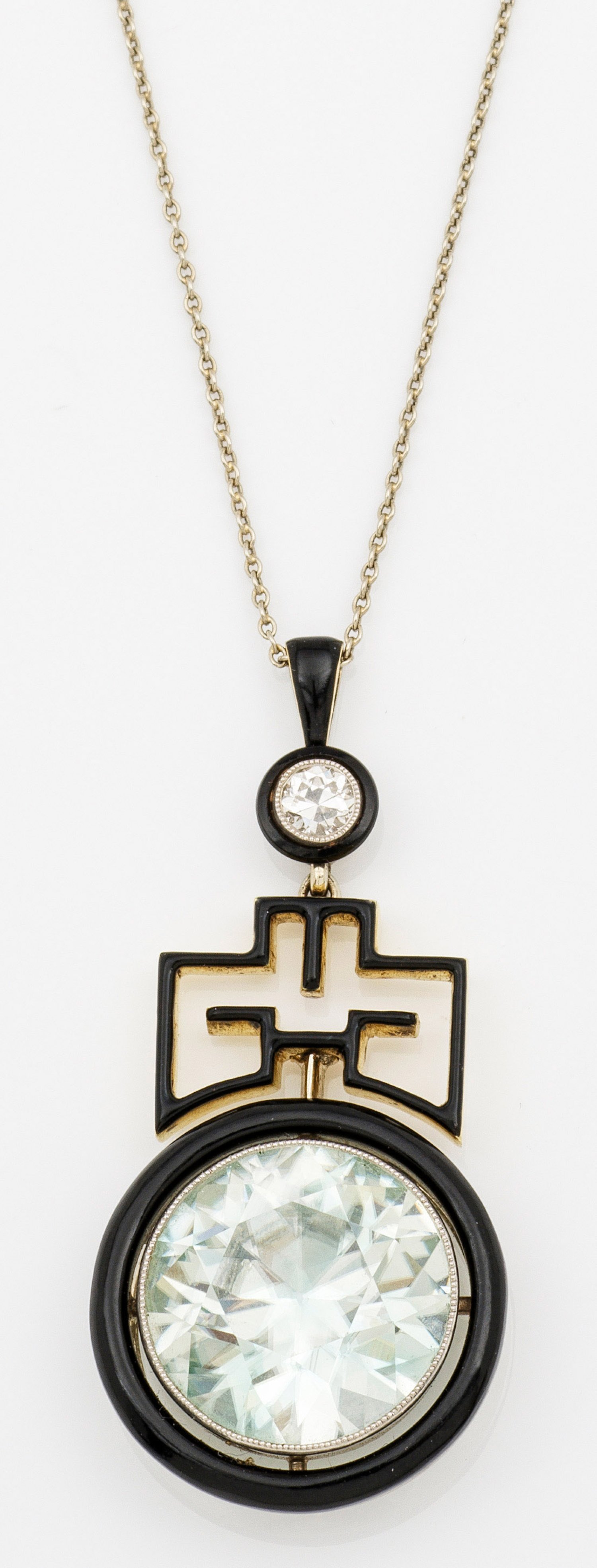 Platin und Gelbgold 14 ct., teilw. schwarz emailliert. Zentral besetzt mit einem himmelblauen Aquamarin von ca. 7,00 ct. und einem kleinen Altschliffdiamanten von ca. 0,20 ct., an sehr feiner Gliederkette. Ges.-Gew. ca. 13,66 g.