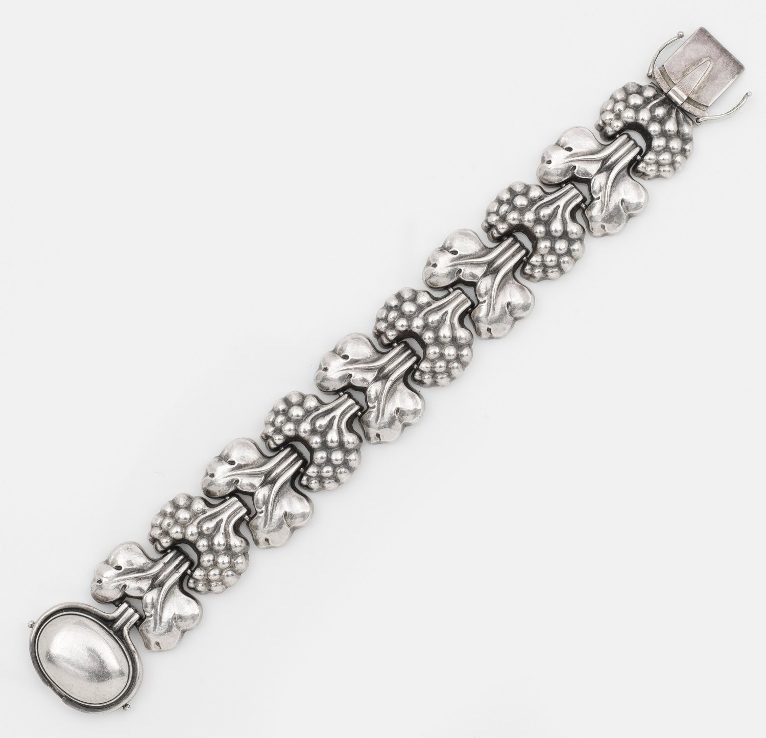 Silber, gest. 925. Floral gestaltetes Armband, Modell Nr. 30 nach einem Entwurf aus der Pariser Zeit Georg Jensens 1924-1926. Ausführung nach 1945. Herstellerzeichen. Gew. ca. 75,88 g.