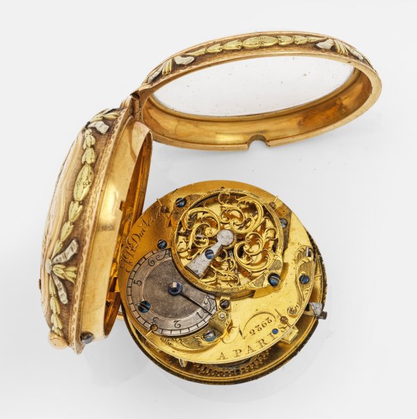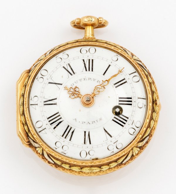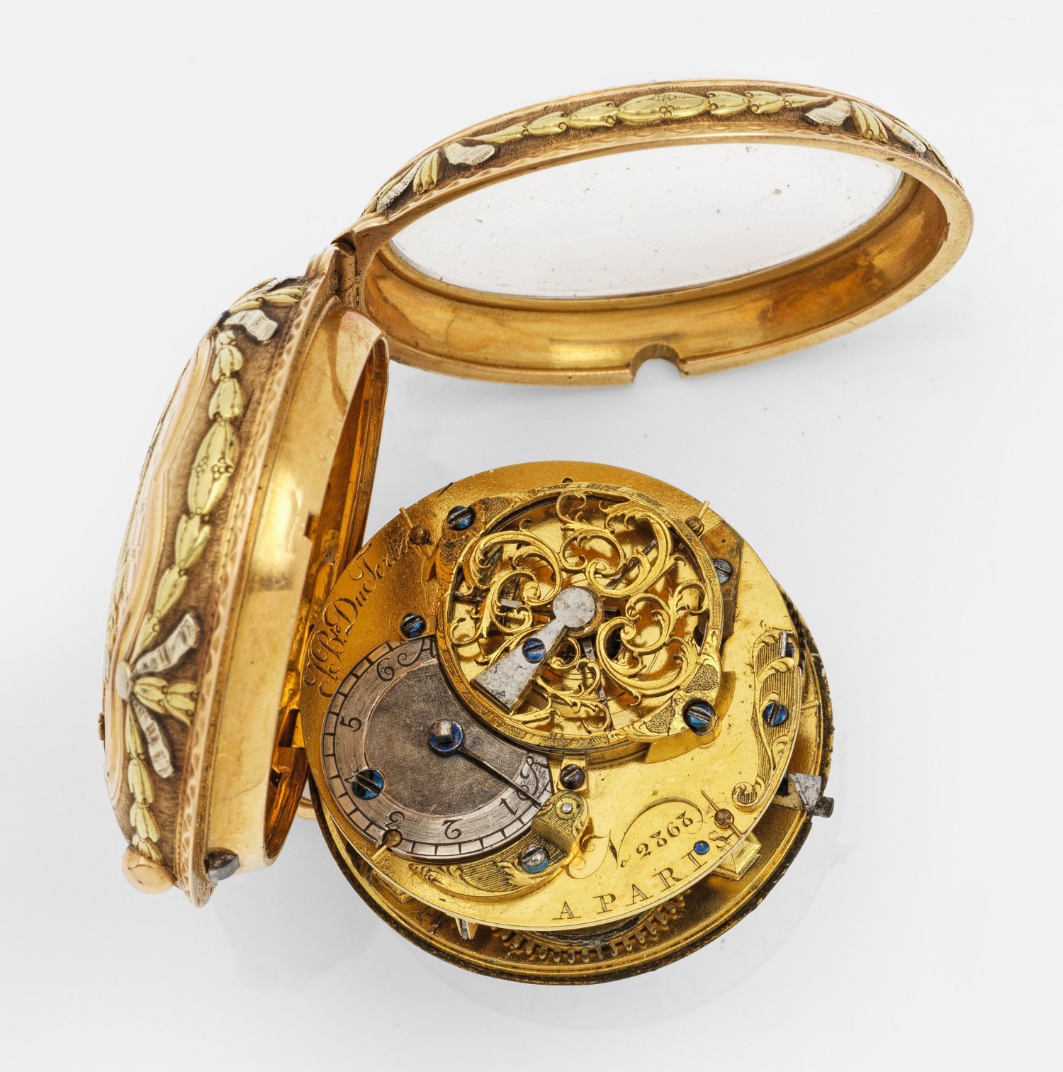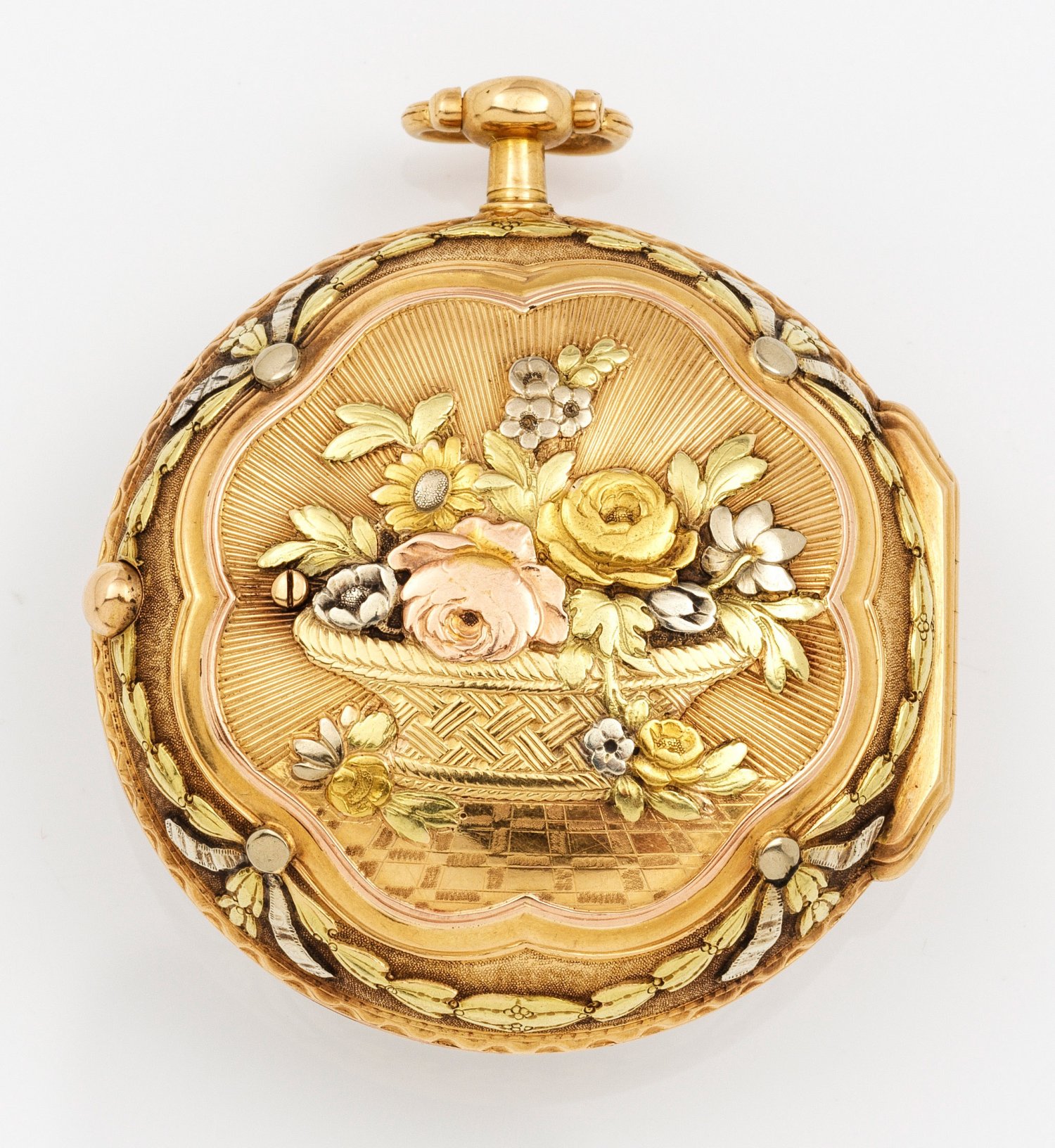 Frankreich. Paris. Um 1730. Gold, 18 k. Üppig punziertes und dekoriertes Gehäuse mit zentralem Rosenkorbmotiv, umrahmt von Girlandenornamenten. Weißes Emailzifferblatt mit römischen Stunden und arabischer Minuterie, vergoldeten Louis VI-Zeigern und Herstellersignet. Vergoldetes Vollplatinenwerk mit Schlüsselaufzug, Spindelhemmung, dreiarmiger Messingunruh unter fein dekorierter Unruhbrücke in Ajour. Platine sign. und num. 2868. D. ca. 45 mm. Gew. ca. 81,58 g.