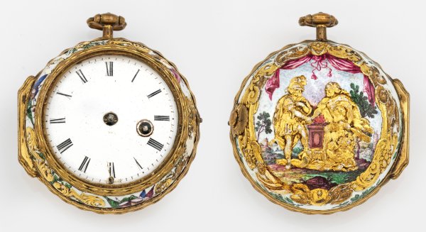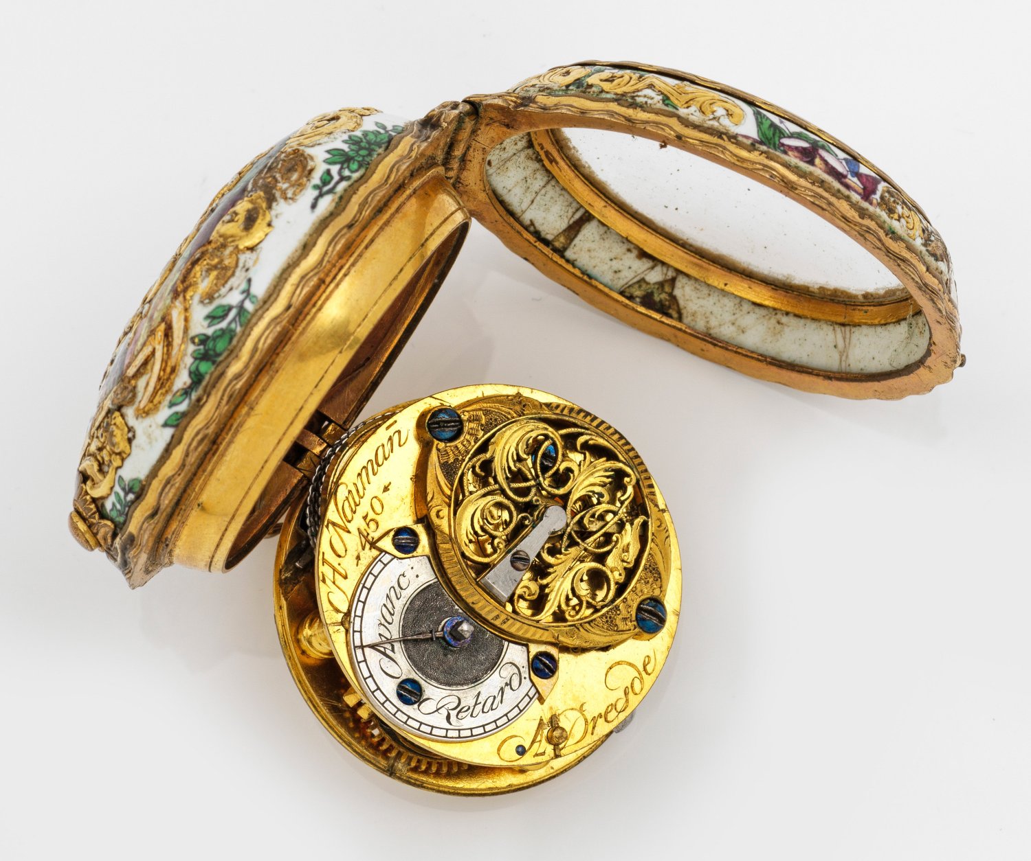 Deutschland. Dresden. Letztes Viertel 18. Jh.; Vergoldetes, emailliertes Messinggehäuse mit teilweise goldgehöhter Antikenszene, im Inneren fein staffierte allegorische Puttenszene. Weißes Email-Zifferblatt mit römischen Indexen. Vergoldetes Vollplatinenwerk mit Kette, Schnecke, Spindelhemmung, dreiarmige Messingunruh unter floral dekorierter Unruhbrücke in Ajour. Platine sign. und num. 450. D. ca. 46 mm. Gew. ca. 85,58 g.