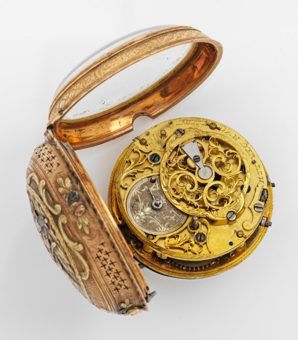 Deutschland. Berlin. Um 1775-1783. Gold, 14 und 18 k. Fein graviertes und punziertes Gehäuse mit floralen und ornamentalen Zierornamenten und zentraler, galanter Rokokoszene. Weißes Emailzifferblatt mit römischen Stunden und arabischer Minuterie, vergoldeten Louis VI-Zeigern und Herstellersignet. Vergoldetes Vollplatinenwerk mit Schlüsselaufzug, Schnecke, Kette, Spindelhemmung, Repetitionsschlag auf Bodenglocke, dreiarmige Messingunruh unter fein dekorierter Unruhbrücke in Ajour. Platine sign.; D. ca. 42 mm. Gew. ca. 72,28 g.