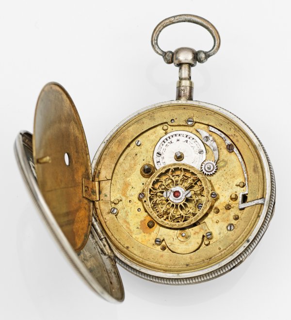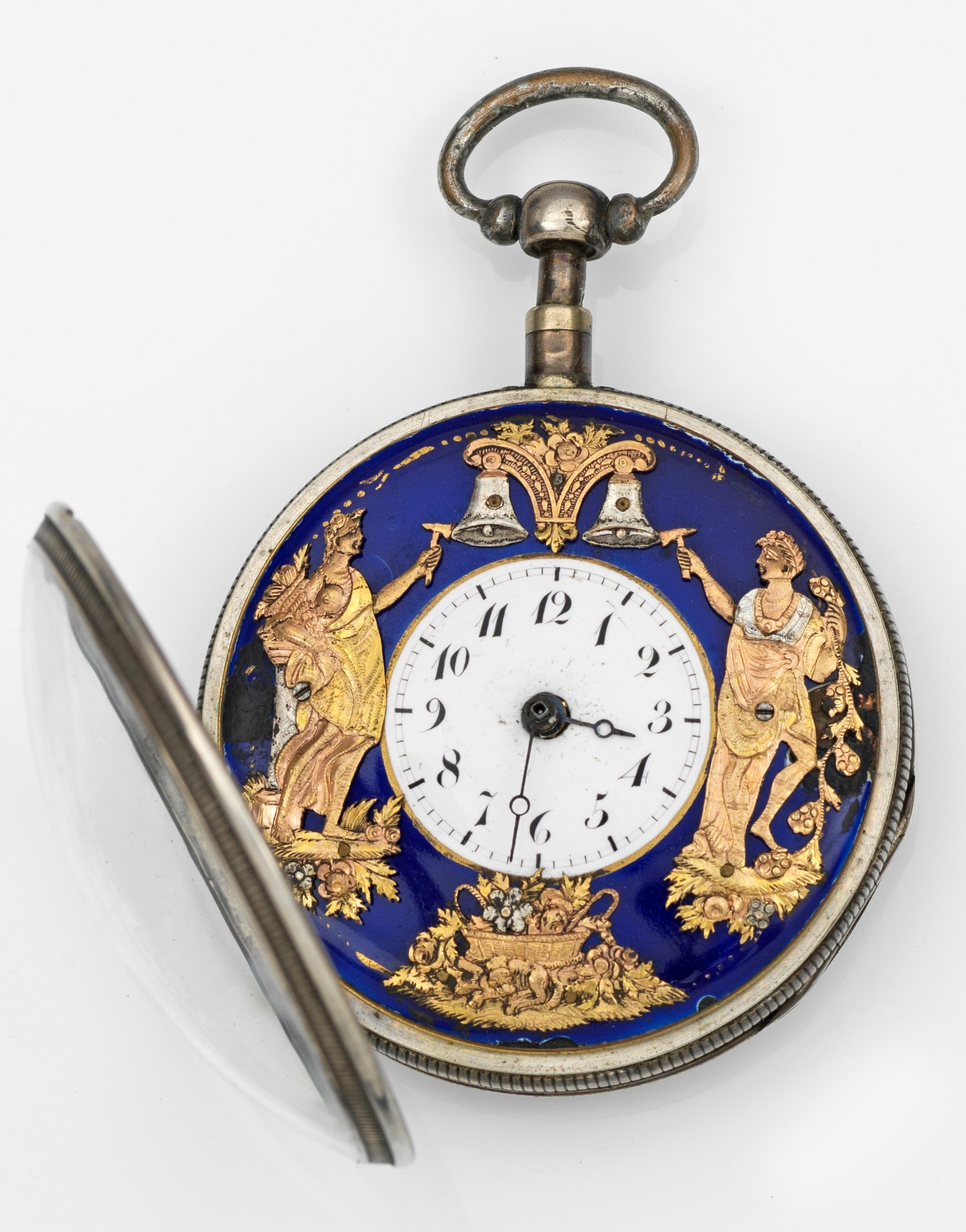 Wohl Schweiz, um 1800/1820. Silber und Metall. Offenes Scharniergehäuse mit geriefter Lünette. Messingcuvette. Weißes Emailzifferblatt mit arabischen Indexen und Breguetzeigern, flankiert von aufgelegten Figuren auf blau emailliertem Ring mit Automatenfunktion durch Schlagen auf die bekrönenden Glocken. Vollplatinenwerk mit Schlüsselaufzug, dreiarmiger Messingunruh unter filigraner Brücke und Repetition auf Tonfeder. Gehäuse-Nr. "JJ5542713 (/) 2213". Ger. besch.; D. 5,5 cm. Gew. ca. 120,00 g.