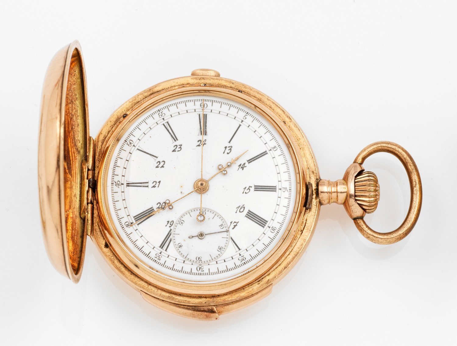 Schweiz. 19. Jh.; Roségold, gest. 585. Glattes Gehäuse mit schauseitig aufgelegter, Schleifen bekrönter Ovalkartusche "Deus Providebit". Gravierte Goldcuvette. Weißes Emailzifferblatt mit römischen und arabischen Indexen, steinbesetzten Louis VI-Zeigern, Stoppfunktion über zentralem Sekundenzeiger und kleiner Sekunde. Räderwerk mit Kronenaufzug, Kompensationsunruh und Repetition. Platine mit Herstellersignet. Nr. 36982. D. ca. 52 mm. Gew. ca. 112,36 g.