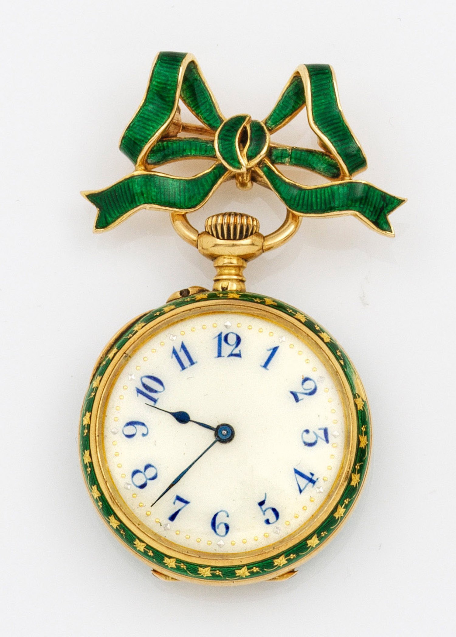 Frankreich, um 1900. Gelbgold, 18 k, Gehäusemacherpunze von Société Générale Des Monteurs De Boîtes, Besançon. Halboffenes Scharniergehäuse mit feiner grüner Transluizidemaillierung. Weißes Emailzifferblatt mit blauen, arabischen Indexen und birnförmigen Zeigern. Brückenwerk mit Kronenaufzug, Ankerhemmung, Kompensationsunruh und gebläuter Breguetspirale. Nr. 80565. Korrespondierende, schleifenförmige Broschierung, abnehmbar. Ges.-Gew. ca. 25,41 g. D. 27 mm.