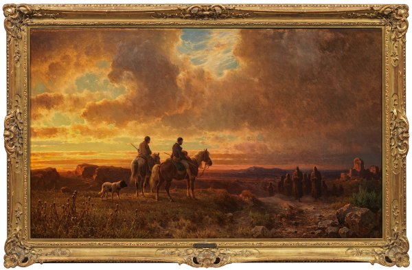 Zwei Hirten zu Pferde und Figurengruppe in südlicher Abendlandschaft