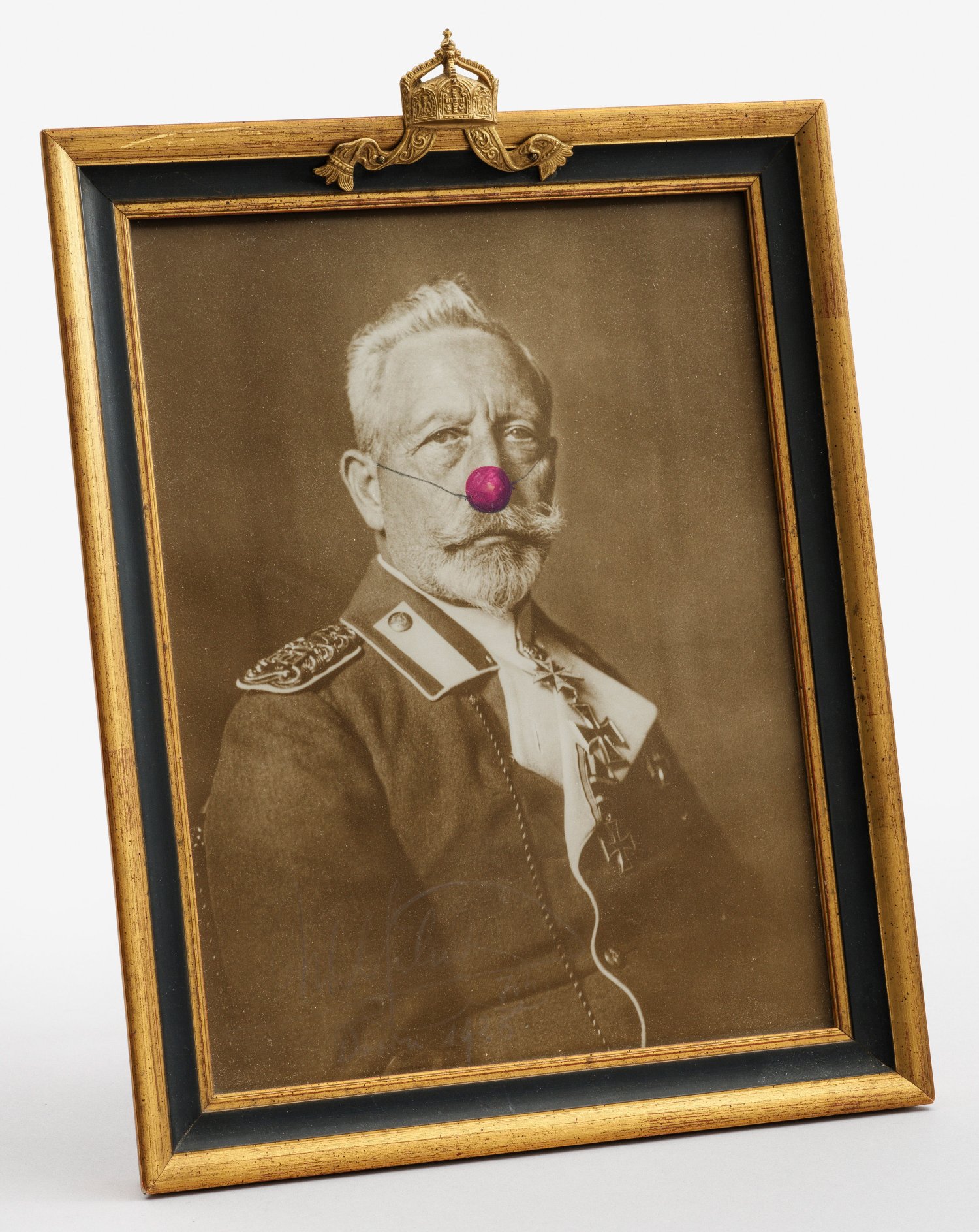 Humoristische Bearbeitung einer Fotografie von Kaiser Wilhelm II., durch Hinzufügen einer rosafarbenen Clownsnase. L. u. mit eigenhändiger Signatur des Kaisers und dat. "Dorn 1925". Bekannt ist Redel durch seine naturalistischen Tierdarstellungen, wodurch er seine enge Verbundenheit mit der Natur zum Ausdruck bringt. Diese Arbeit spiegelt eine weitere künstlerische Ebene Redels wider. Durch das Hinzufügen eines einzelnen Objektes in einen vorhandenen Bildtypus, wird dieser abgeändert und der Betrachter dazu gezwungen, dieses in sich (ab)geschlossene Bildthema neu zu erfassen. Verso auf Rückenkarton bez. "Collage: E. H. Redel...". 21,5 cm x 28,3 cm. Originaler Rahmen mit applizierter Kaiserkrone.