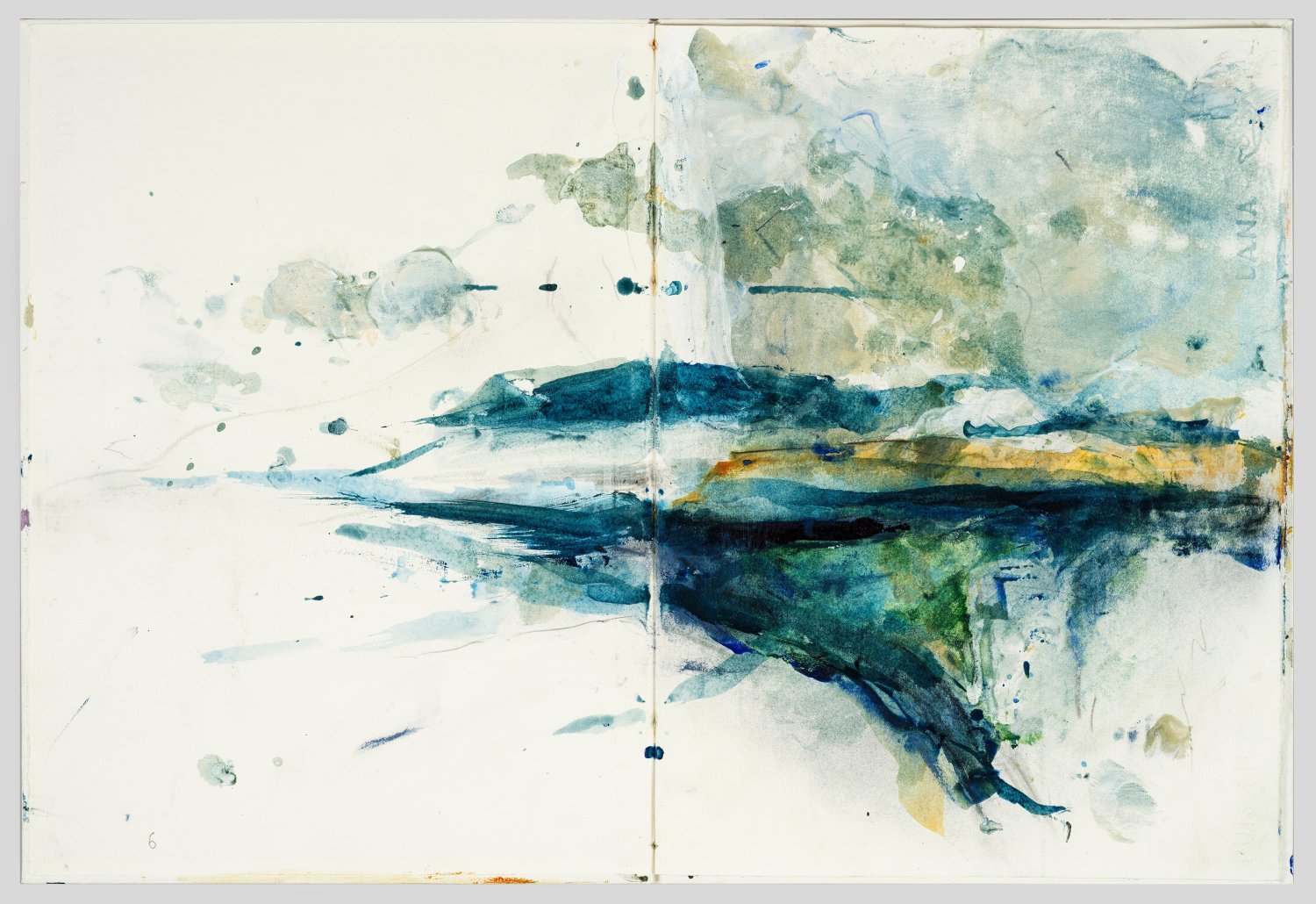 Mischtechnik auf Papier. 14 Seiten sowie der Umschlag mit an Landschaften erinnernden Bildgefügen, vom österreichischen Künstler Heinz Göbel bemalt. Anbei ein Informationsblatt zu Leben und Werk des Künstlers. Buchdeckel sign.; Nicht kollationiert. 38,5 cm x 29 cm.