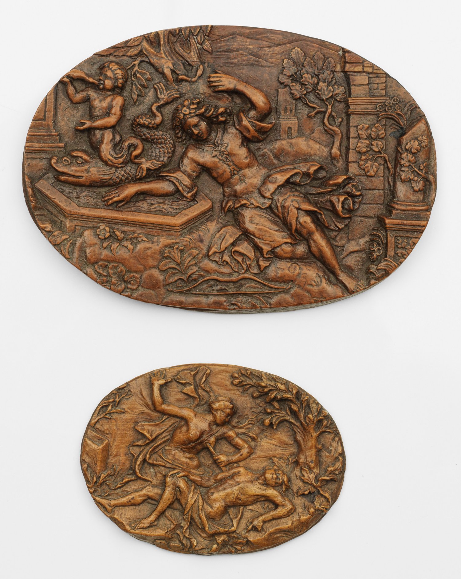 South German or Italian sculptor active 16th/17th C.; Two finely carved oval boxwood miniature relief plaques.