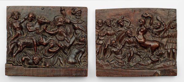 Gegenstücke. Buchsbaum, geschnitzt. Leicht querrechteckige Tafeln mit abgesetztem unteren Rand als Sockel für die detailreich ausgeführten, vielfigurigen Szenen, die eine den Kampf gegen eine Kentaurin, die andere gegen einen Reiter darstellend. 12,5-12,7 cm x 14,3 cm-14,5 cm.