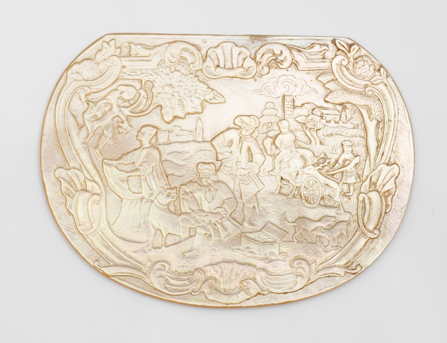 Über kleinem Messingsockel mit Klammer zum Befestigen eine ovale, dünne Platte, oberhalb mit gerader Kante. Von C-Schwüngen und Muschelwerk gerahmte reliefierte, fein ausgeführte szenische Darstellung auf der rechten Seite einer Jagdgesellschaft auf dem Heimweg mit erlegtem Hirsch auf einem Wagen, umgeben von mehreren Hunden. Auf der linken Seite mehrere Personen beim Pflücken von Früchten eines Baumes. Im Hintergrund eine Stadtansicht. 7,5 cm x 5,5 cm.