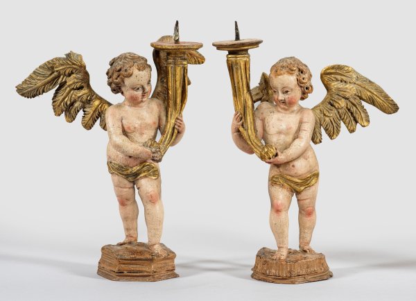 Gegenstücke. Lindenholz, geschnitzt und gefasst. Vollplastische Darstellung. Auf einer sechseckigen, profilierten bzw. unregelmäßigen, rocaillereliefierten Plinthe in schreitender Pose stehende, kindliche Engel mit kurzem, gelocktem Haar und vor die Scham gelegtem Tuch, mit beiden Händen jeweils ein Füllhorn als Schaft des Leuchters haltend. H. 31 cm.
