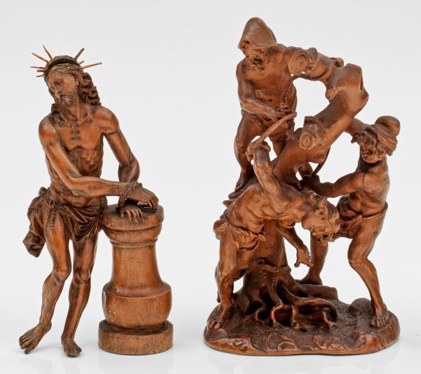 Buchsbaum, geschnitzt. Eine meisterhafte, fein ausgeführte Gruppe mit der Darstellung des Hl. Sebastian, der von zwei Schergen an einen Baum gefesselt wird; eine Figur mit stehendem Christus an der Geißelsäule. H. 9 cm - 12 cm.