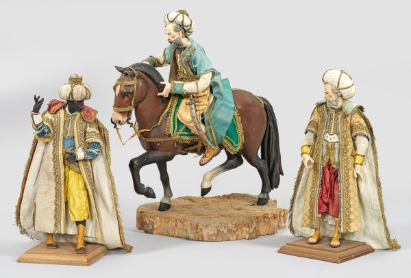 Holz geschnitzt, polychrom gefasst und bemalt sowie unterschiedliche Materialien. Drei einzeln ausgeführte Figuren in reichen, prunkvollen, orientalischen Kostümen mit Turbanen. Der eine der älteren vollbärtigen Könige als Reiterstatuette auf einer runden Baumscheibe als Plinthe, die anderen beiden kleineren Figuren auf rechteckigen Holzplinthen stehend. Ges.-H. 38 cm-52,5 cm.