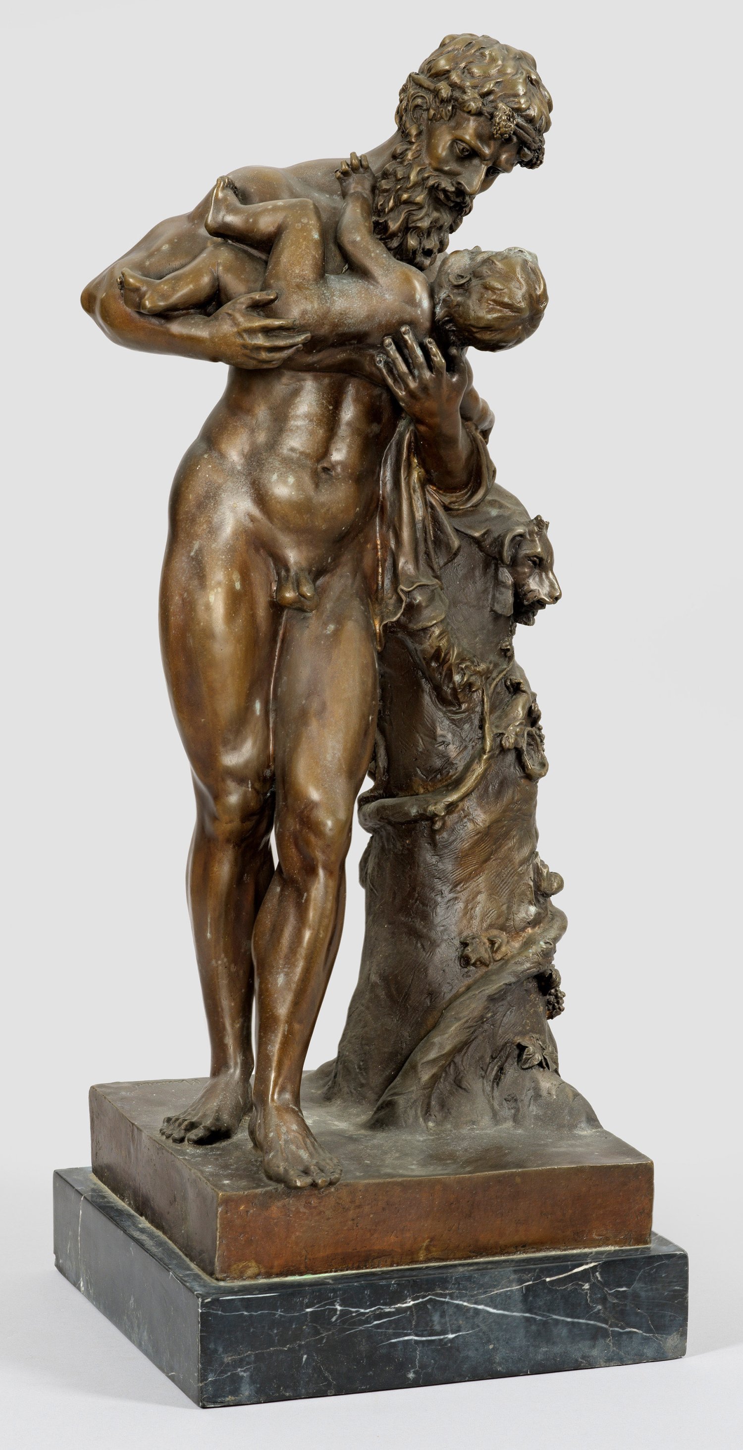 Bronze, dunkelbraun patiniert. Künstler-Bez.; Schwarzer Marmorsockel. Guss 21. Jh.; Stark verkleinerte Bronzeversion nach der Marmorskulptur, die auch als "Faune portant Bacchus enfant" bzw. "Silène portant Bacchus" bekannt ist (auch genannt "Grand Faune Borghèse" oder "Grand Faune Farnèse") von Simon Mazière, die dieser 1684-1686 für den Schlosspark von Versailles schuf. Mazière kopierte hierbei wiederum eine Bronze in den Florentiner Uffizien von Jacopo del Duca (von 1571-1574) nach der berühmten, antiken, römischen, schon vor 1569 entdeckten Marmorskulptur, die sich später in der Borghese-Sammlung in Rom befand (seit 1815 im Louvre). Ges.-H. 58 cm.