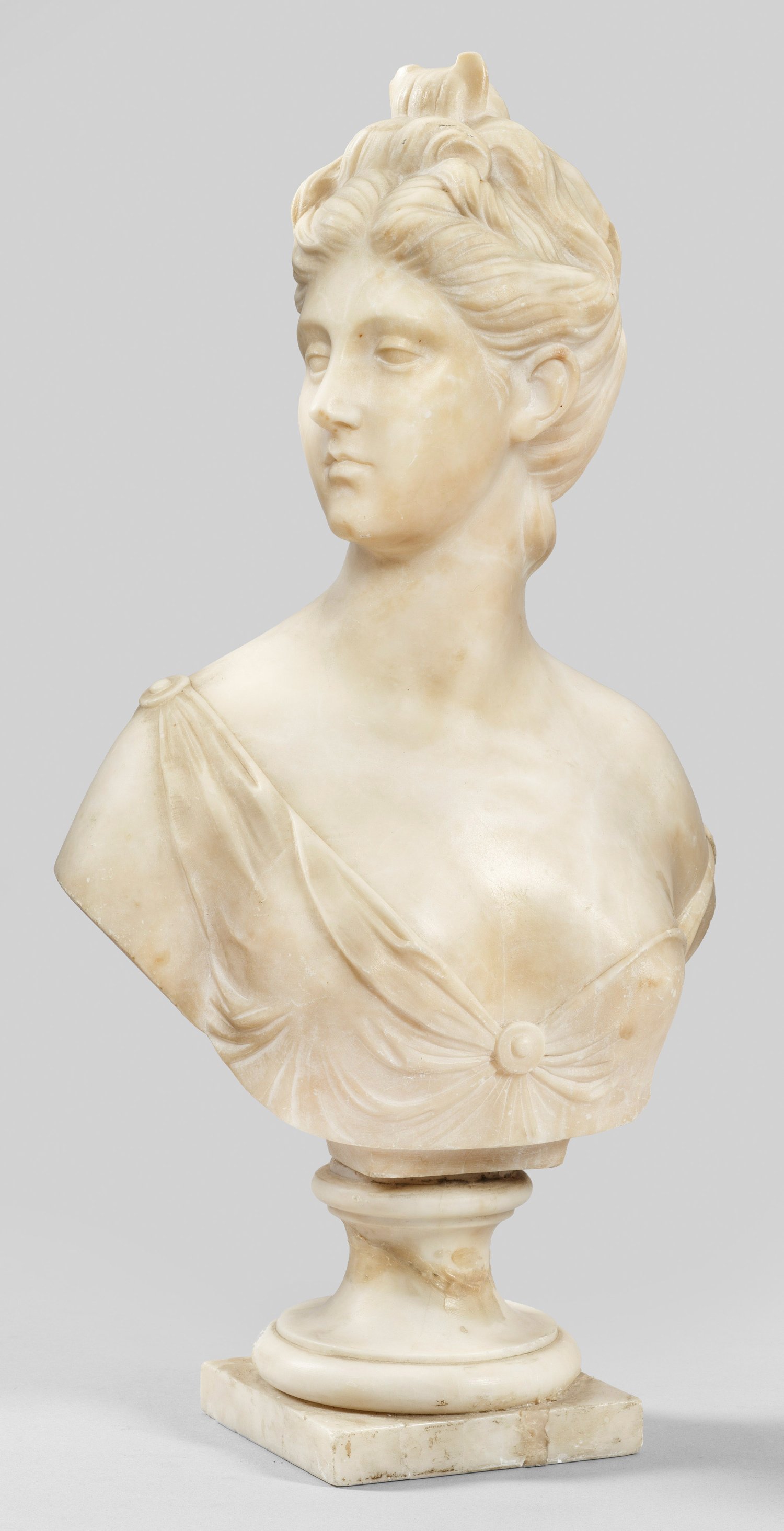 Alabaster. Künstler-Bez.; Im 19. Jh. bildhauerisch fein und qualitätvoll ausgeführte Büste mit ins Profil gewendetem Kopf, inspiriert. nach der 1780 von Houdon vollendeten, großen, ganzfigurigen Marmorskulptur der Jagdgöttin Diana, die sich heute im Gulbenkian-Museum in Lissabon befindet. Houdon war einer der bedeutendsten Bildhauer seiner Zeit, er genoss besonders durch seine Bildnisskulpturen internationale Berühmtheit an den Fürstenhöfen Europas und in den USA. Seit 1767 schuf er überdies mehrere Büsten und lebensgroße Skulpturen Dianas, die großes Aufsehen erregten. Werke Houdons befinden sich u. a. im Louvre und Metropolitan Museum. Sockel rep.; H. 50 cm.
