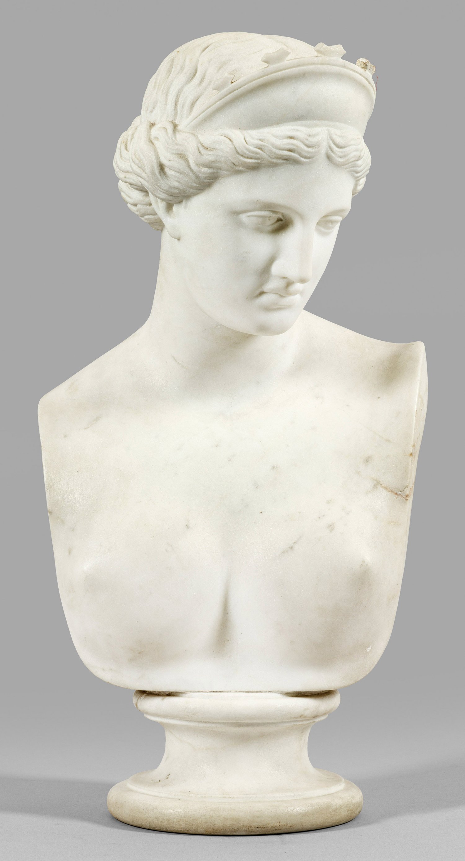 Weißer Marmor. Vollplastische, fein ausgeführte Darstellung der nach links unten blickenden Venus mit Diadem im Haar, komponiert auf einer profilierten Säulenbasis. Büste nach der antiken, römischen Marmorskulptur im Nationalmuseum in Neapel, die während der Kaiserzeit Hadrians (117-138 n. Chr.) entstand, vermutlich wie die Venus von Milo auf einer verlorenen Aphrodite-Skulptur aus Bronze des griechischen Bildhauers Lysippos basierend. Wegen ihrer großen Schönheit und Harmonie wurde die 1750 in Capua entdeckte Skulptur seit dem 18. Jh. vielfach kopiert und auch Büsten der "Venus Capua" geschaffen. H. 54,5 cm.