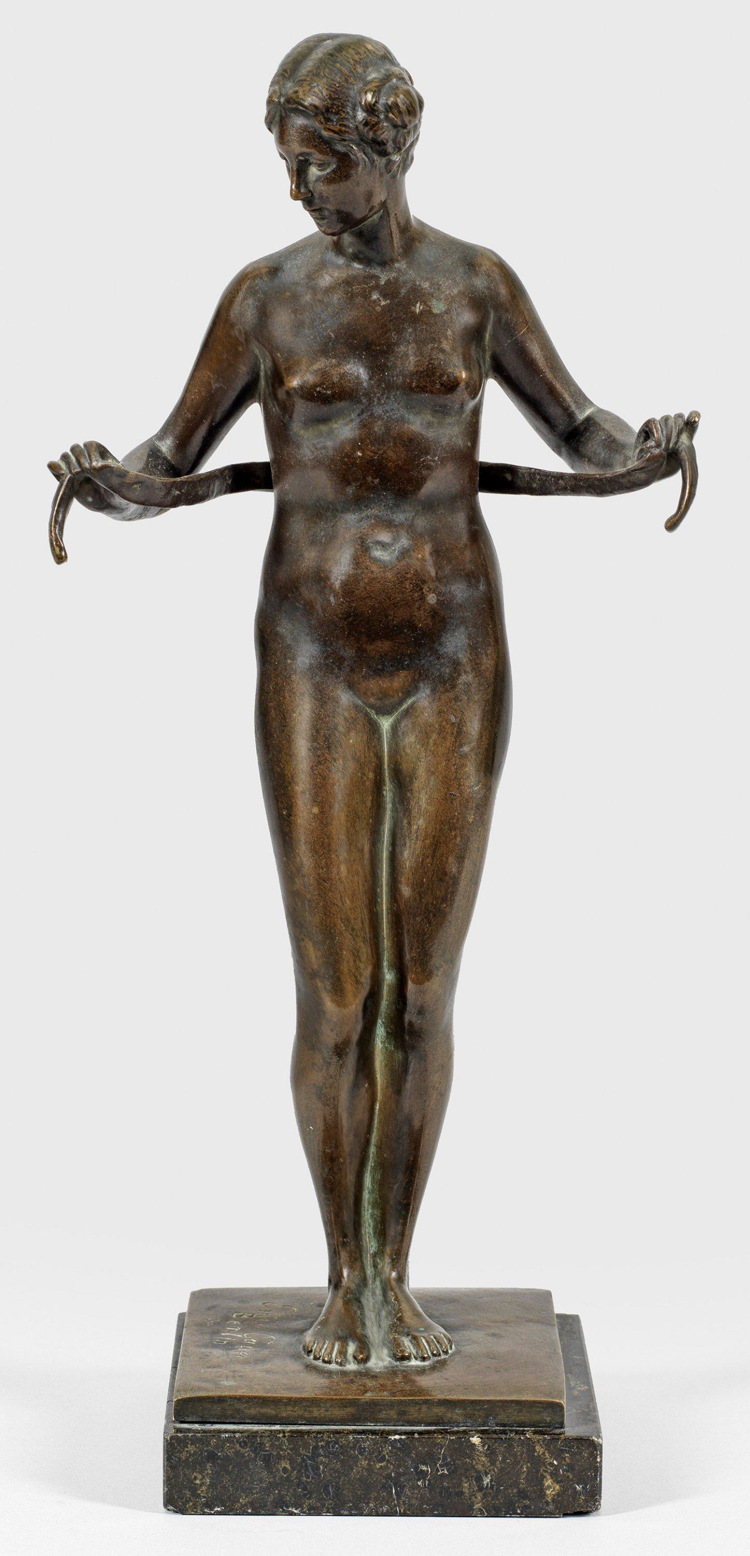 Bronze, dunkelbraun patiniert, 1912. Sign. "Emil Cauer Berlin", Gießerstempel "LAUCHHAMMER BILDGUSS" mit Signet u. Nr. 41. Serpentinsockel. 1912 geschaffene Jugendstil-Aktstatuette Cauers, deren Modell er 1913 auf der Großen Berliner Kunstausstellung zeigte. Ges.-H. 41,8 cm.