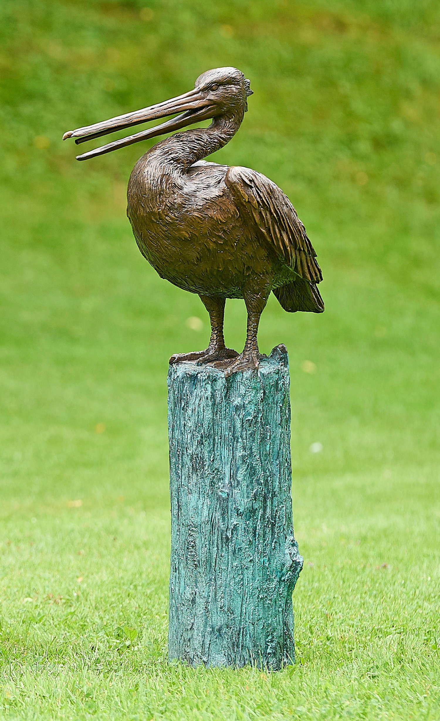 Contemporary animal sculptor active 21st C.; Brown and green patinated bronze garden sculpture of a pelican sitting on a post.